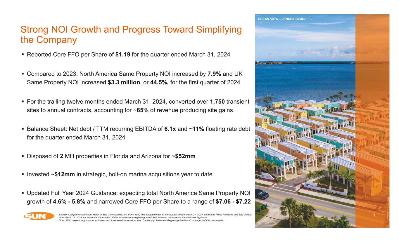 7.7% 9.1% 7.1% 6.9% 6.7% 7.3% 4.0% 11.2% 5.8% 7.3% 4.6% 2014 2015 2016 2017 2018 2019 2020 2021 2022 2023 2024E 2.0% 2.9% 3.1% 4.2% 5.4% 6.1% 5.4% 4.8% 7.6% 8.7% 6.5% 2014 2015 2016 2017 2018 2019 2020 2021 2022 2023 2024E ¹ CPI-U 3.4% 3.4% 3.3% 3.6% 4.0% 4.2% 3.4% 3.4% 4.6% 6.4% 5.4% 2014 2015 2016 2017 2018 2019 2020 2021 2022 2023 2024E ¹ CPI-U Robust Fundamentals Continue to Drive Performance 6 7.9% North America same property NOI growth in 1Q24; expect 4.6% - 5.8% growth in 2024 to be driven by rental rate increases and occupancy gains Consistent annual rental rate increases exceed expected inflationary cost pressures o Expected average rental rate increases: North America MH 5.4%, Annual RV 6.5%, Marina 5.6%, UK 7.1% Occupancy gains, including strategic focus on converting transient guests into annual residents, increase our stream of stable revenue and improves operational efficiencies o Since the start of 2020, we have completed nearly 7,100 conversions through March 31, 2024, and we intend to continue driving conversions Steady, Organic Growth MH Average Rental Rate Increases RV Average Rental Rate Increases Occupancy Same Property NOI Growth 10-Year Actual Average Same Property NOI Growth: 7.3% 10-Year Actual Average Rental Rate Growth: 4.0% 10-Year Actual Average Rental Rate Growth: 5.0% Source: Company information and U.S. Bureau of Labor Statistics. Refer to Sun Communities, Inc. Form 10-Q and Supplemental for the quarter ended March 31, 2024, as well as Press Releases and SEC Filings after March 31, 2024, for additional information. Refer to information regarding non-GAAP financial measures in the attached Appendix. Note: With respect to guidance, estimates and forecasted information, see “Cautionary Statement Regarding Guidance” on page 2 of this presentation. 1) Preliminary 2024 rental rate increases. CPI-U 12-month percentage change as of March 2024. 2) Same Property MH and Annual RV occupancy, adjusted for recently completed but vacant expansion sites. 5.8% 93.2% 95.9% 96.6% 97.3% 98.0% 98.4% 98.8% 98.9% 98.6% 98.9% 98.9% 2014 2015 2016 2017 2018 2019 2020 2021 2022 2023 1Q24 Same Property Occupancy(2) 468 962 1,159 1,133 863 1,665 2,257 2,111 176 2016 2017 2018 2019 2020 2021 2022 2023 1Q24 RV Transient to Annual Conversions