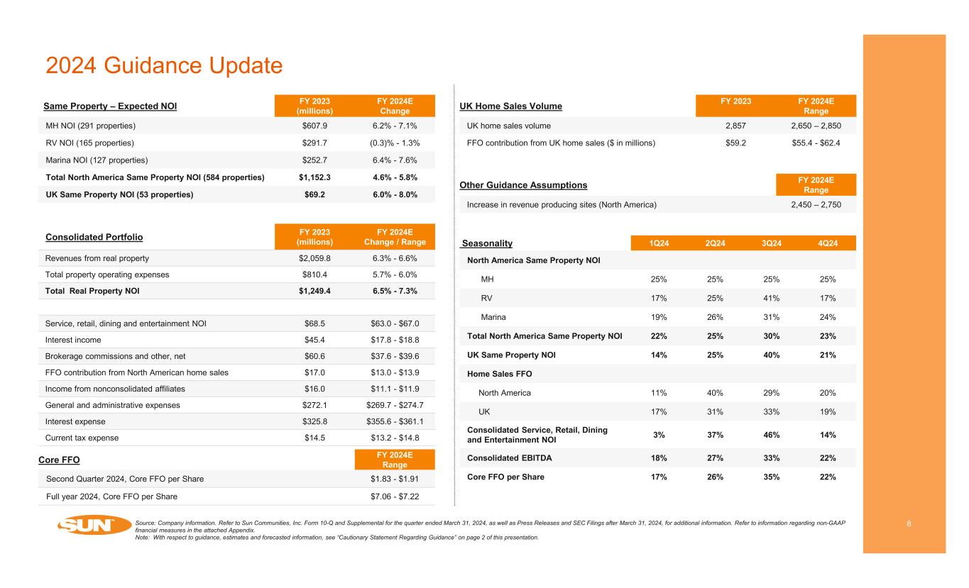 Strong NOI Growth and Progress Toward Simplifying the Company Reported Core FFO per Share of $1.19 for the quarter ended March 31, 2024 Compared to 2023, North America Same Property NOI increased by 7.9% and UK Same Property NOI increased $3.3 million, or 44.5%, for the first quarter of 2024 For the trailing twelve months ended March 31, 2024, converted over 1,750 transient sites to annual contracts, accounting for ~65% of revenue producing site gains Balance Sheet: Net debt / TTM recurring EBITDA of 6.1x and ~11% floating rate debt for the quarter ended March 31, 2024 Disposed of 2 MH properties in Florida and Arizona for ~$52mm Invested ~$12mm in strategic, bolt-on marina acquisitions year to date Updated Full Year 2024 Guidance: expecting total North America Same Property NOI growth of 4.6% - 5.8% and narrowed Core FFO per Share to a range of $7.06 - $7.22 7 OCEAN VIEW – JENSEN BEACH, FL Source: Company information. Refer to Sun Communities, Inc. Form 10-Q and Supplemental for the quarter ended March 31, 2024, as well as Press Releases and SEC Filings after March 31, 2024, for additional information. Refer to information regarding non-GAAP financial measures in the attached Appendix. Note: With respect to guidance, estimates and forecasted information, see “Cautionary Statement Regarding Guidance” on page 2 of this presentation.