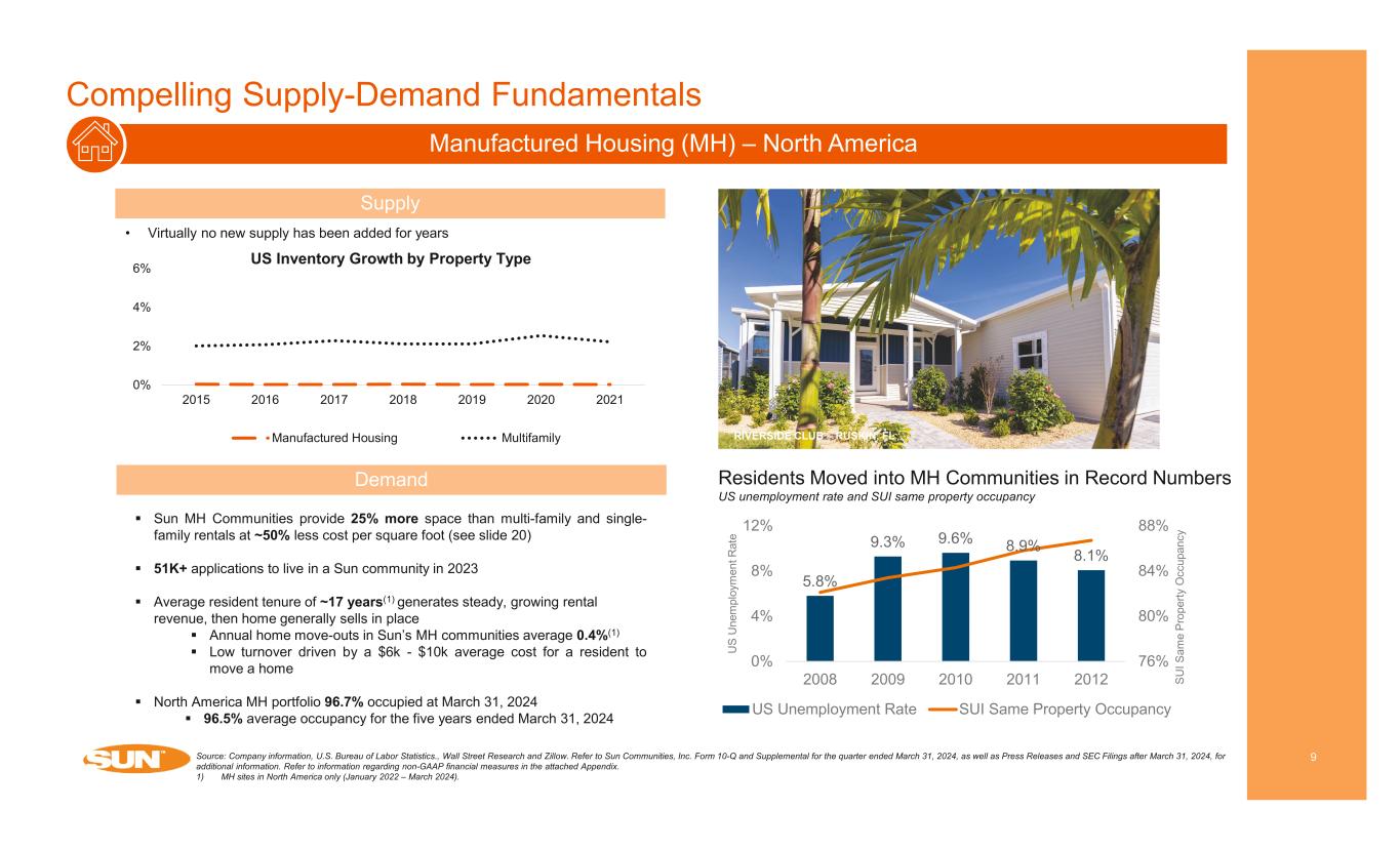2024 Guidance Update 8 Seasonality 1Q24 2Q24 3Q24 4Q24 North America Same Property NOI MH 25% 25% 25% 25% RV 17% 25% 41% 17% Marina 19% 26% 31% 24% Total North America Same Property NOI 22% 25% 30% 23% UK Same Property NOI 14% 25% 40% 21% Home Sales FFO North America 11% 40% 29% 20% UK 17% 31% 33% 19% Consolidated Service, Retail, Dining and Entertainment NOI 3% 37% 46% 14% Consolidated EBITDA 18% 27% 33% 22% Core FFO per Share 17% 26% 35% 22% Core FFO FY 2024E Range Second Quarter 2024, Core FFO per Share $1.83 - $1.91 Full year 2024, Core FFO per Share $7.06 - $7.22 Same Property – Expected NOI FY 2023 (millions) FY 2024E Change MH NOI (291 properties) $607.9 6.2% - 7.1% RV NOI (165 properties) $291.7 (0.3)% - 1.3% Marina NOI (127 properties) $252.7 6.4% - 7.6% Total North America Same Property NOI (584 properties) $1,152.3 4.6% - 5.8% UK Same Property NOI (53 properties) $69.2 6.0% - 8.0% Consolidated Portfolio FY 2023 (millions) FY 2024E Change / Range Revenues from real property $2,059.8 6.3% - 6.6% Total property operating expenses $810.4 5.7% - 6.0% Total Real Property NOI $1,249.4 6.5% - 7.3% Service, retail, dining and entertainment NOI $68.5 $63.0 - $67.0 Interest income $45.4 $17.8 - $18.8 Brokerage commissions and other, net $60.6 $37.6 - $39.6 FFO contribution from North American home sales $17.0 $13.0 - $13.9 Income from nonconsolidated affiliates $16.0 $11.1 - $11.9 General and administrative expenses $272.1 $269.7 - $274.7 Interest expense $325.8 $355.6 - $361.1 Current tax expense $14.5 $13.2 - $14.8 Source: Company information. Refer to Sun Communities, Inc. Form 10-Q and Supplemental for the quarter ended March 31, 2024, as well as Press Releases and SEC Filings after March 31, 2024, for additional information. Refer to information regarding non-GAAP financial measures in the attached Appendix. Note: With respect to guidance, estimates and forecasted information, see “Cautionary Statement Regarding Guidance” on page 2 of this presentation. UK Home Sales Volume FY 2023 FY 2024E Range UK home sales volume 2,857 2,650 – 2,850 FFO contribution from UK home sales ($ in millions) $59.2 $55.4 - $62.4 Other Guidance Assumptions FY 2024E Range Increase in revenue producing sites (North America) 2,450 – 2,750