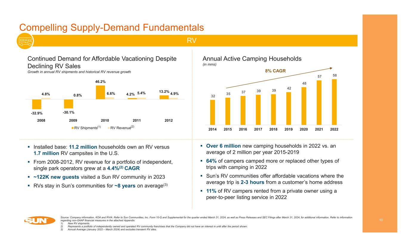 Compelling Supply-Demand Fundamentals 9 Manufactured Housing (MH) – North America Source: Company information, U.S. Bureau of Labor Statistics., Wall Street Research and Zillow. Refer to Sun Communities, Inc. Form 10-Q and Supplemental for the quarter ended March 31, 2024, as well as Press Releases and SEC Filings after March 31, 2024, for additional information. Refer to information regarding non-GAAP financial measures in the attached Appendix. 1) MH sites in North America only (January 2022 – March 2024). 0% 2% 4% 6% 2015 2016 2017 2018 2019 2020 2021 US Inventory Growth by Property Type Manufactured Housing Multifamily BOWLAND FELL- YORKSHIRE, UK • Virtually no new supply has been added for years Sun MH Communities provide 25% more space than multi-family and single- family rentals at ~50% less cost per square foot (see slide 20) 51K+ applications to live in a Sun community in 2023 Average resident tenure of ~17 years(1) generates steady, growing rental revenue, then home generally sells in place Annual home move-outs in Sun’s MH communities average 0.4%(1) Low turnover driven by a $6k - $10k average cost for a resident to move a home North America MH portfolio 96.7% occupied at March 31, 2024 96.5% average occupancy for the five years ended March 31, 2024 Demand Supply Residents Moved into MH Communities in Record Numbers US unemployment rate and SUI same property occupancy RIVERSIDE CLUB – RUSKIN, FL 5.8% 9.3% 9.6% 8.9% 8.1% 76% 80% 84% 88% 0% 4% 8% 12% 2008 2009 2010 2011 2012 SU I S am e Pr op er ty O cc up an cy U S U ne m pl oy m en t R at e US Unemployment Rate SUI Same Property Occupancy