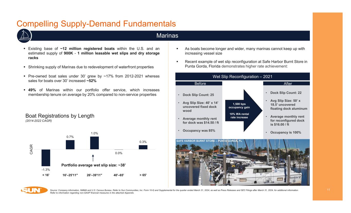 Compelling Supply-Demand Fundamentals 10 RV Continued Demand for Affordable Vacationing Despite Declining RV Sales Growth in annual RV shipments and historical RV revenue growth Installed base: 11.2 million households own an RV versus 1.7 million RV campsites in the U.S. From 2008-2012, RV revenue for a portfolio of independent, single park operators grew at a 4.4%(2) CAGR ~122K new guests visited a Sun RV community in 2023 RVs stay in Sun’s communities for ~8 years on average(3) Source: Company information, KOA and RVIA. Refer to Sun Communities, Inc. Form 10-Q and Supplemental for the quarter ended March 31, 2024, as well as Press Releases and SEC Filings after March 31, 2024, for additional information. Refer to information regarding non-GAAP financial measures in the attached Appendix. 1) New RV shipments. 2) Represents a portfolio of independently owned and operated RV community franchises that the Company did not have an interest in until after the period shown. 3) Annual Average (January 2022 – March 2024) and excludes transient RV sites. -32.9% -30.1% 46.2% 4.2% 13.2%4.8% 0.8% 6.6% 5.4% 4.9% 2008 2009 2010 2011 2012 RV Shipments RV Revenue(2) Over 6 million new camping households in 2022 vs. an average of 2 million per year 2015-2019 64% of campers camped more or replaced other types of trips with camping in 2022 Sun’s RV communities offer affordable vacations where the average trip is 2-3 hours from a customer’s home address 11% of RV campers rented from a private owner using a peer-to-peer listing service in 2022 32 35 37 39 39 42 48 57 58 2014 2015 2016 2017 2018 2019 2020 2021 2022 Annual Active Camping Households (in mms) 8% CAGR (1)