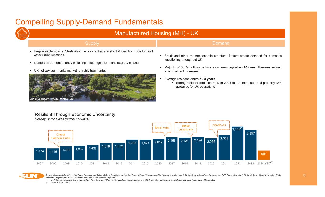 Marinas Compelling Supply-Demand Fundamentals 11Source: Company information, NMMA and U.S. Census Bureau. Refer to Sun Communities, Inc. Form 10-Q and Supplemental for the quarter ended March 31, 2024, as well as Press Releases and SEC Filings after March 31, 2024, for additional information. Refer to information regarding non-GAAP financial measures in the attached Appendix. Existing base of ~12 million registered boats within the U.S. and an estimated supply of 900K - 1 million leasable wet slips and dry storage racks Shrinking supply of Marinas due to redevelopment of waterfront properties Pre-owned boat sales under 30’ grew by ~17% from 2012-2021 whereas sales for boats over 30’ increased ~52% 49% of Marinas within our portfolio offer service, which increases membership tenure on average by 20% compared to non-service properties Boat Registrations by Length (2014-2022 CAGR) -1.3% 0.7% 1.0% 0.0% 0.3% < 16' 16'–25'11" 26'–39'11" 40'–65' > 65' C AG R Portfolio average wet slip size: ~38’ As boats become longer and wider, many marinas cannot keep up with increasing vessel size Recent example of wet slip reconfiguration at Safe Harbor Burnt Store in Punta Gorda, Florida demonstrates higher rate achievement: • Dock Slip Count: 22 • Avg Slip Size: 50’ x 18.5’ uncovered floating dock aluminum • Average monthly rent for reconfigured dock is $16.00 / ft • Occupancy is 100% Wet Slip Reconfiguration – 2021 • Dock Slip Count: 25 • Avg Slip Size: 40’ x 14’ uncovered fixed dock wood • Average monthly rent for dock was $14.50 / ft • Occupancy was 85% 1,500 bps occupancy gain 10% WA rental rate increase Before After SAFE HARBOR BURNT STORE – PUNTA GORDA, FL