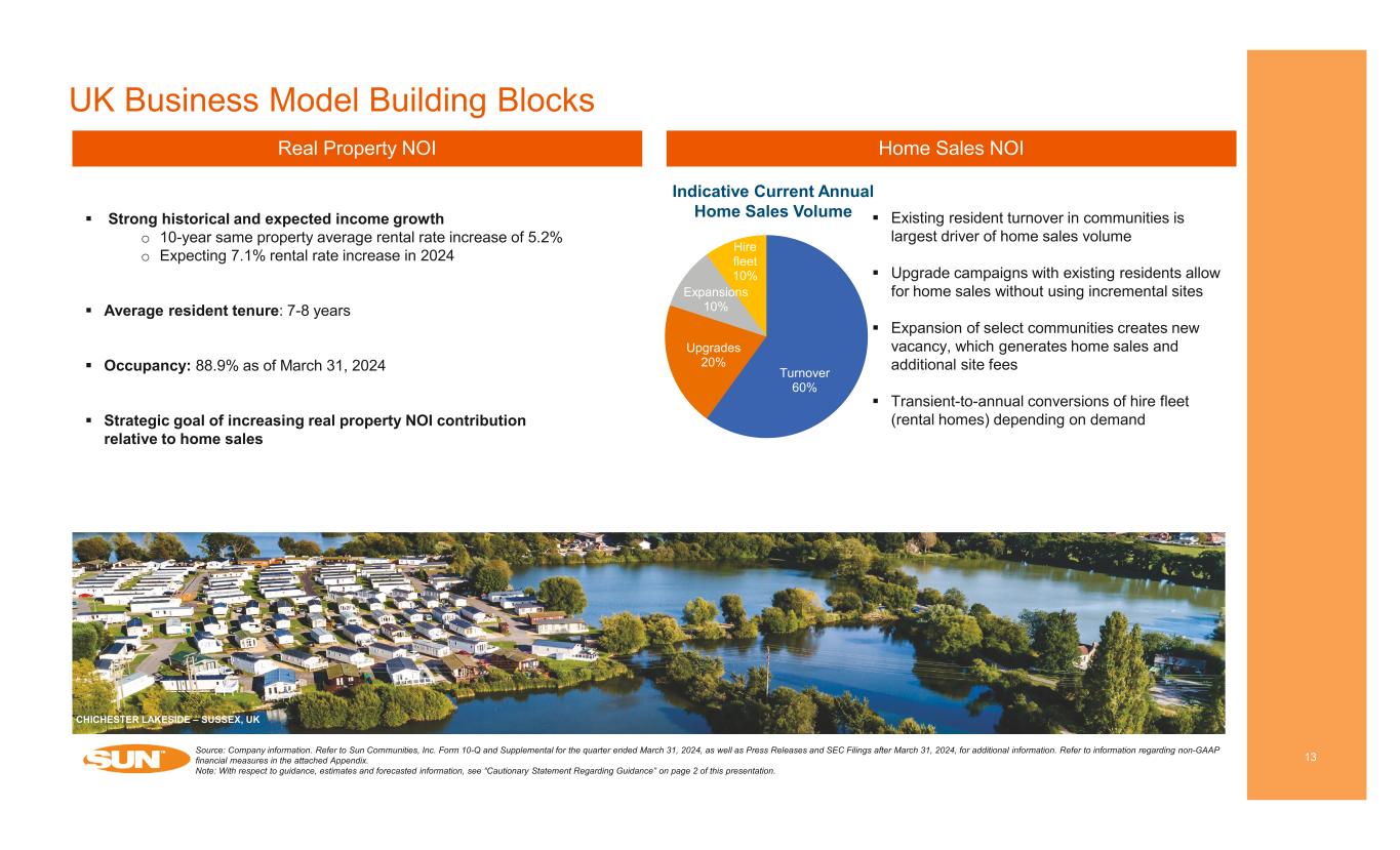 Compelling Supply-Demand Fundamentals 12 Manufactured Housing (MH) - UK Source: Company information, Wall Street Research and Zillow. Refer to Sun Communities, Inc. Form 10-Q and Supplemental for the quarter ended March 31, 2024, as well as Press Releases and SEC Filings after March 31, 2024, for additional information. Refer to information regarding non-GAAP financial measures in the attached Appendix. 1) Includes pre-acquisition home sales volume from the original Park Holidays portfolio acquired on April 8, 2022, and other subsequent acquisitions, as well as home sales at Sandy Bay. 2) As of April 30, 2024. BRYNTEG HOLDAY PARK – WALES, UK Irreplaceable coastal ‘destination’ locations that are short drives from London and other urban locations Numerous barriers to entry including strict regulations and scarcity of land UK holiday community market is highly fragmented Brexit and other macroeconomic structural factors create demand for domestic vacationing throughout UK Majority of Sun’s holiday parks are owner-occupied on 20+ year licenses subject to annual rent increases Average resident tenure 7 - 8 years Strong resident retention YTD in 2023 led to increased real property NOI guidance for UK operations DemandSupply 1,174 1,116 1,299 1,357 1,423 1,618 1,632 1,930 1,921 2,012 2,166 2,131 2,194 2,066 2,368 3,168 2,857 901 2007 2008 2009 2010 2011 2012 2013 2014 2015 2016 2017 2018 2019 2020 2021 2022 2023 2024 YTD Global Financial Crisis Brexit uncertainty COVID-19 Brexit vote Resilient Through Economic Uncertainty Holiday Home Sales (number of units) (1) (2)