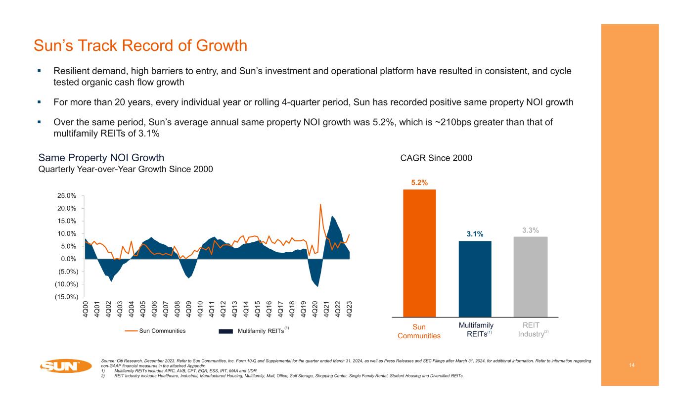 UK Business Model Building Blocks 13 Source: Company information. Refer to Sun Communities, Inc. Form 10-Q and Supplemental for the quarter ended March 31, 2024, as well as Press Releases and SEC Filings after March 31, 2024, for additional information. Refer to information regarding non-GAAP financial measures in the attached Appendix. Note: With respect to guidance, estimates and forecasted information, see “Cautionary Statement Regarding Guidance” on page 2 of this presentation. Real Property NOI Strong historical and expected income growth o 10-year same property average rental rate increase of 5.2% o Expecting 7.1% rental rate increase in 2024 Average resident tenure: 7-8 years Occupancy: 88.9% as of March 31, 2024 Strategic goal of increasing real property NOI contribution relative to home sales Turnover 60% Upgrades 20% Expansions 10% Hire fleet 10% Existing resident turnover in communities is largest driver of home sales volume Upgrade campaigns with existing residents allow for home sales without using incremental sites Expansion of select communities creates new vacancy, which generates home sales and additional site fees Transient-to-annual conversions of hire fleet (rental homes) depending on demand Indicative Current Annual Home Sales Volume Home Sales NOI CHICHESTER LAKESIDE – SUSSEX, UK