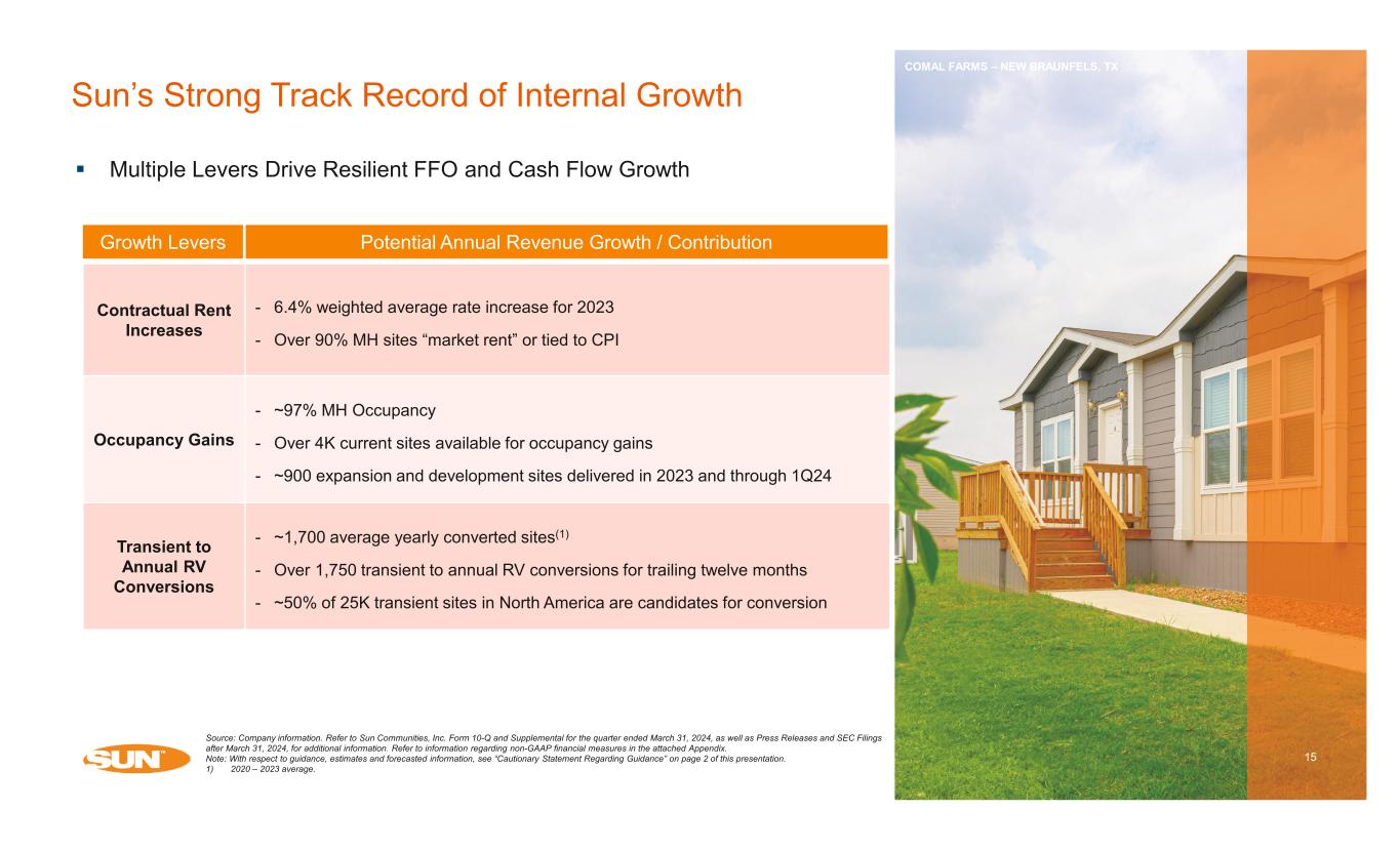Sun’s Track Record of Growth 14 Multifamily REITsSun Communities Resilient demand, high barriers to entry, and Sun’s investment and operational platform have resulted in consistent, and cycle tested organic cash flow growth For more than 20 years, every individual year or rolling 4-quarter period, Sun has recorded positive same property NOI growth Over the same period, Sun’s average annual same property NOI growth was 5.2%, which is ~210bps greater than that of multifamily REITs of 3.1% Same Property NOI Growth Quarterly Year-over-Year Growth Since 2000 Source: Citi Research, December 2023. Refer to Sun Communities, Inc. Form 10-Q and Supplemental for the quarter ended March 31, 2024, as well as Press Releases and SEC Filings after March 31, 2024, for additional information. Refer to information regarding non-GAAP financial measures in the attached Appendix. 1) Multifamily REITs includes AIRC, AVB, CPT, EQR, ESS, IRT, MAA and UDR. 2) REIT Industry includes Healthcare, Industrial, Manufactured Housing, Multifamily, Mall, Office, Self Storage, Shopping Center, Single Family Rental, Student Housing and Diversified REITs. (1) CAGR Since 2000 Sun Communities Multifamily REITs REIT Industry(1) (2) 5.2% 3.1% 3.3% (15.0%) (10.0%) (5.0%) 0.0% 5.0% 10.0% 15.0% 20.0% 25.0% 4Q 00 4Q 01 4Q 02 4Q 03 4Q 04 4Q 05 4Q 06 4Q 07 4Q 08 4Q 09 4Q 10 4Q 11 4Q 12 4Q 13 4Q 14 4Q 15 4Q 16 4Q 17 4Q 18 4Q 19 4Q 20 4Q 21 4Q 22 4Q 23