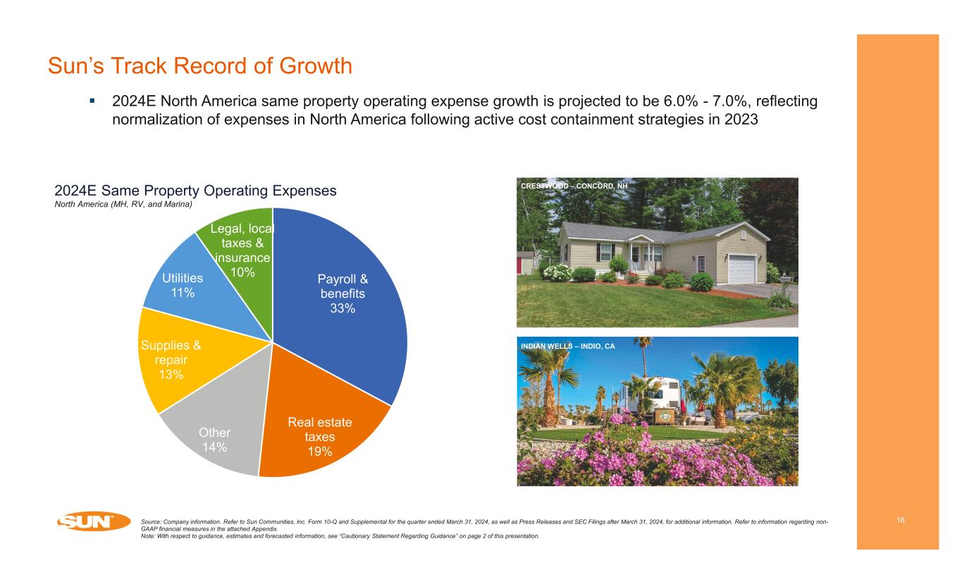 Sun’s Strong Track Record of Internal Growth 15 Multiple Levers Drive Resilient FFO and Cash Flow Growth Growth Levers Potential Annual Revenue Growth / Contribution Contractual Rent Increases - 6.4% weighted average rate increase for 2023 - Over 90% MH sites “market rent” or tied to CPI Occupancy Gains - ~97% MH Occupancy - Over 4K current sites available for occupancy gains - ~900 expansion and development sites delivered in 2023 and through 1Q24 Transient to Annual RV Conversions - ~1,700 average yearly converted sites(1) - Over 1,750 transient to annual RV conversions for trailing twelve months - ~50% of 25K transient sites in North America are candidates for conversion Source: Company information. Refer to Sun Communities, Inc. Form 10-Q and Supplemental for the quarter ended March 31, 2024, as well as Press Releases and SEC Filings after March 31, 2024, for additional information. Refer to information regarding non-GAAP financial measures in the attached Appendix. Note: With respect to guidance, estimates and forecasted information, see “Cautionary Statement Regarding Guidance” on page 2 of this presentation. 1) 2020 – 2023 average. COMAL FARMS – NEW BRAUNFELS, TX