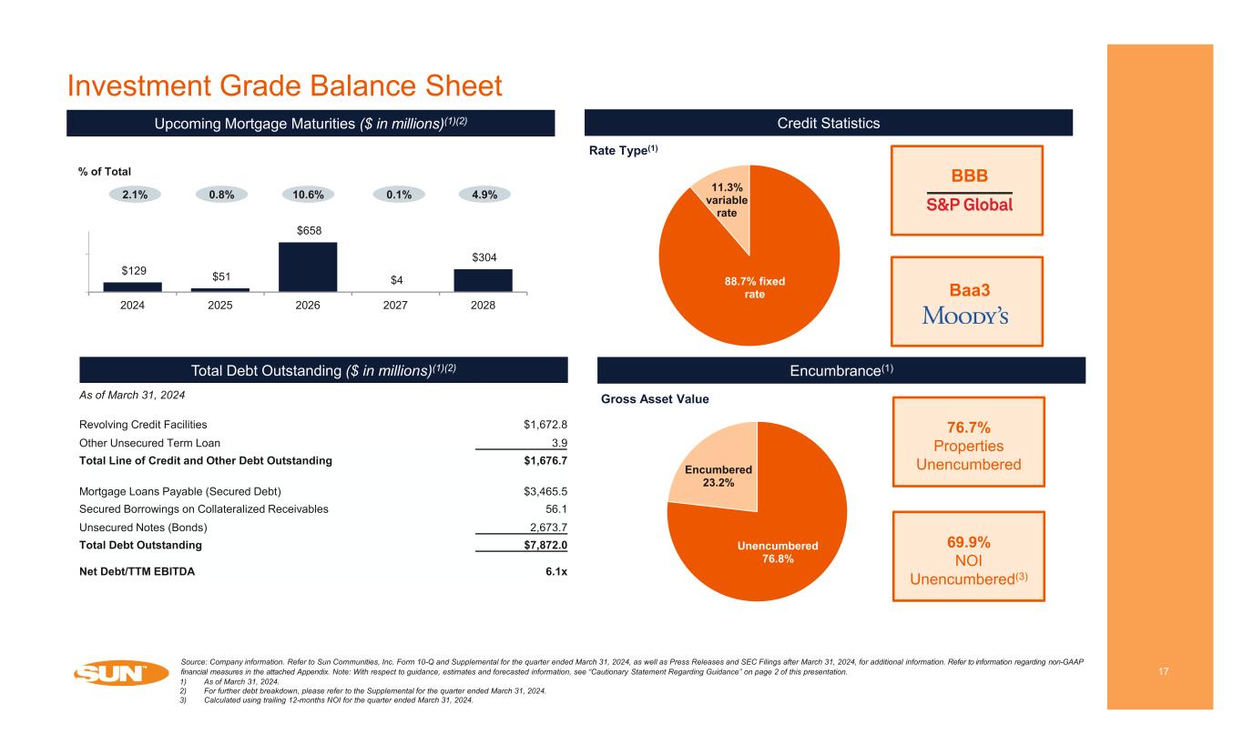 Payroll & benefits 33% Real estate taxes 19% Other 14% Supplies & repair 13% Utilities 11% Legal, local taxes & insurance 10% Sun’s Track Record of Growth 16 2024E Same Property Operating Expenses North America (MH, RV, and Marina) CRESTWOOD – CONCORD, NH Source: Company information. Refer to Sun Communities, Inc. Form 10-Q and Supplemental for the quarter ended March 31, 2024, as well as Press Releases and SEC Filings after March 31, 2024, for additional information. Refer to information regarding non- GAAP financial measures in the attached Appendix. Note: With respect to guidance, estimates and forecasted information, see “Cautionary Statement Regarding Guidance” on page 2 of this presentation. 2024E North America same property operating expense growth is projected to be 6.0% - 7.0%, reflecting normalization of expenses in North America following active cost containment strategies in 2023 INDIAN WELLS – INDIO, CA
