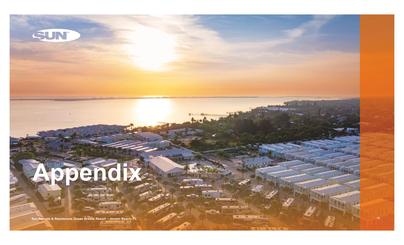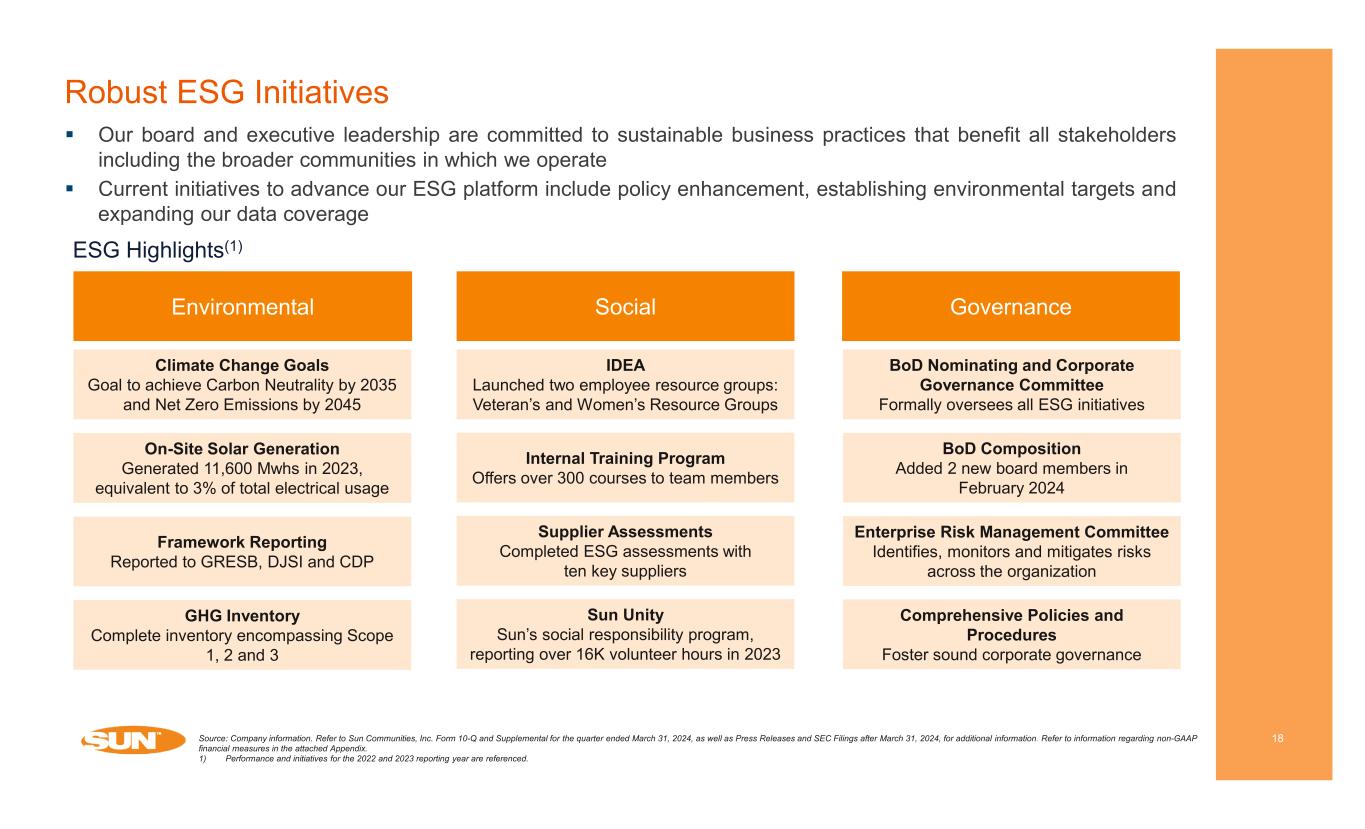 Investment Grade Balance Sheet 17 Unencumbered 76.8% Encumbered 23.2% 88.7% fixed rate 11.3% variable rate Credit Statistics Rate Type(1) Upcoming Mortgage Maturities ($ in millions)(1)(2) 2.1% 0.8% 10.6% 0.1% % of Total Encumbrance(1) Gross Asset Value 69.9% NOI Unencumbered(3) 76.7% Properties Unencumbered Total Debt Outstanding ($ in millions)(1)(2) $129 $51 $658 $4 $304 2024 2025 2026 2027 2028 As of March 31, 2024 Revolving Credit Facilities $1,672.8 Other Unsecured Term Loan 3.9 Total Line of Credit and Other Debt Outstanding $1,676.7 Mortgage Loans Payable (Secured Debt) $3,465.5 Secured Borrowings on Collateralized Receivables 56.1 Unsecured Notes (Bonds) 2,673.7 Total Debt Outstanding $7,872.0 Net Debt/TTM EBITDA 6.1x BBB Baa3 4.9% Source: Company information. Refer to Sun Communities, Inc. Form 10-Q and Supplemental for the quarter ended March 31, 2024, as well as Press Releases and SEC Filings after March 31, 2024, for additional information. Refer to information regarding non-GAAP financial measures in the attached Appendix. Note: With respect to guidance, estimates and forecasted information, see “Cautionary Statement Regarding Guidance” on page 2 of this presentation. 1) As of March 31, 2024. 2) For further debt breakdown, please refer to the Supplemental for the quarter ended March 31, 2024. 3) Calculated using trailing 12-months NOI for the quarter ended March 31, 2024.