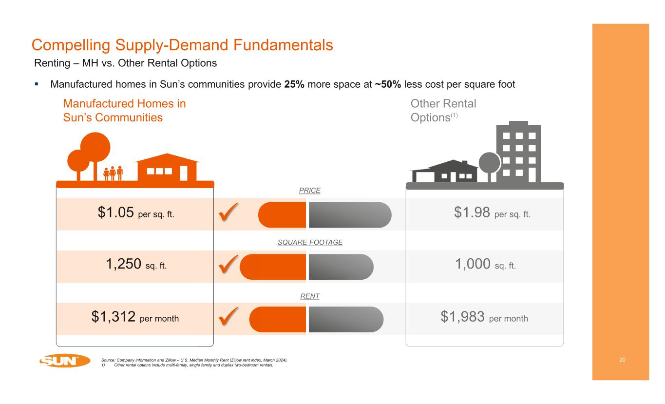 Robust ESG Initiatives 18 Environmental ESG Highlights(1) Our board and executive leadership are committed to sustainable business practices that benefit all stakeholders including the broader communities in which we operate Current initiatives to advance our ESG platform include policy enhancement, establishing environmental targets and expanding our data coverage Social Internal Training Program Offers over 300 courses to team members IDEA Launched two employee resource groups: Veteran’s and Women’s Resource Groups Governance BoD Nominating and Corporate Governance Committee Formally oversees all ESG initiatives Enterprise Risk Management Committee Identifies, monitors and mitigates risks across the organization Supplier Assessments Completed ESG assessments with ten key suppliers BoD Composition Added 2 new board members in February 2024 Sun Unity Sun’s social responsibility program, reporting over 16K volunteer hours in 2023 Comprehensive Policies and Procedures Foster sound corporate governance Source: Company information. Refer to Sun Communities, Inc. Form 10-Q and Supplemental for the quarter ended March 31, 2024, as well as Press Releases and SEC Filings after March 31, 2024, for additional information. Refer to information regarding non-GAAP financial measures in the attached Appendix. 1) Performance and initiatives for the 2022 and 2023 reporting year are referenced. Climate Change Goals Goal to achieve Carbon Neutrality by 2035 and Net Zero Emissions by 2045 On-Site Solar Generation Generated 11,600 Mwhs in 2023, equivalent to 3% of total electrical usage Framework Reporting Reported to GRESB, DJSI and CDP GHG Inventory Complete inventory encompassing Scope 1, 2 and 3