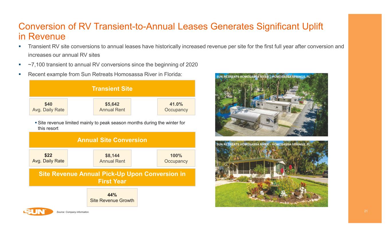 Compelling Supply-Demand Fundamentals 20 Renting – MH vs. Other Rental Options Manufactured homes in Sun’s communities provide 25% more space at ~50% less cost per square foot Manufactured Homes in Sun’s Communities RENT $1,312 per month Other Rental Options(1) $1,983 per month SQUARE FOOTAGE PRICE 1,250 sq. ft. 1,000 sq. ft. $1.05 per sq. ft. $1.98 per sq. ft. Source: Company Information and Zillow – U.S. Median Monthly Rent (Zillow rent index, March 2024). 1) Other rental options include multi-family, single family and duplex two-bedroom rentals.