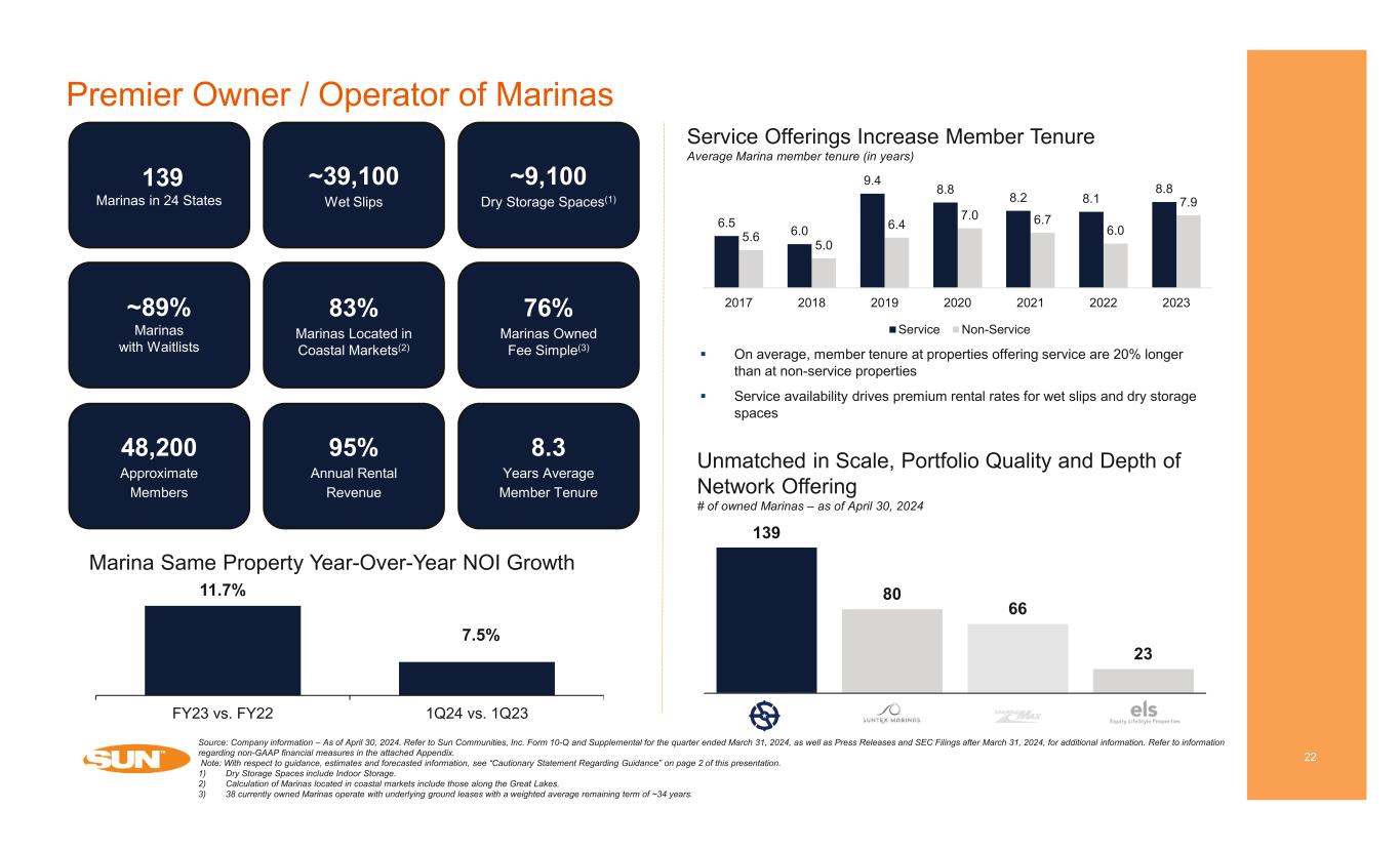 11.7% 7.5% FY23 vs. FY22 1Q24 vs. 1Q23 Marina Same Property Year-Over-Year NOI Growth Premier Owner / Operator of Marinas 22 139 Marinas in 24 States ~39,100 Wet Slips ~89% Marinas with Waitlists 83% Marinas Located in Coastal Markets(2) 76% Marinas Owned Fee Simple(3) ~9,100 Dry Storage Spaces(1) 48,200 Approximate Members 95% Annual Rental Revenue 8.3 Years Average Member Tenure Source: Company information – As of April 30, 2024. Refer to Sun Communities, Inc. Form 10-Q and Supplemental for the quarter ended March 31, 2024, as well as Press Releases and SEC Filings after March 31, 2024, for additional information. Refer to information regarding non-GAAP financial measures in the attached Appendix. Note: With respect to guidance, estimates and forecasted information, see “Cautionary Statement Regarding Guidance” on page 2 of this presentation. 1) Dry Storage Spaces include Indoor Storage. 2) Calculation of Marinas located in coastal markets include those along the Great Lakes. 3) 38 currently owned Marinas operate with underlying ground leases with a weighted average remaining term of ~34 years. Service Offerings Increase Member Tenure Average Marina member tenure (in years) Unmatched in Scale, Portfolio Quality and Depth of Network Offering # of owned Marinas – as of April 30, 2024 6.5 6.0 9.4 8.8 8.2 8.1 8.8 5.6 5.0 6.4 7.0 6.7 6.0 7.9 2017 2018 2019 2020 2021 2022 2023 Service Non-Service 139 80 66 23 On average, member tenure at properties offering service are 20% longer than at non-service properties Service availability drives premium rental rates for wet slips and dry storage spaces