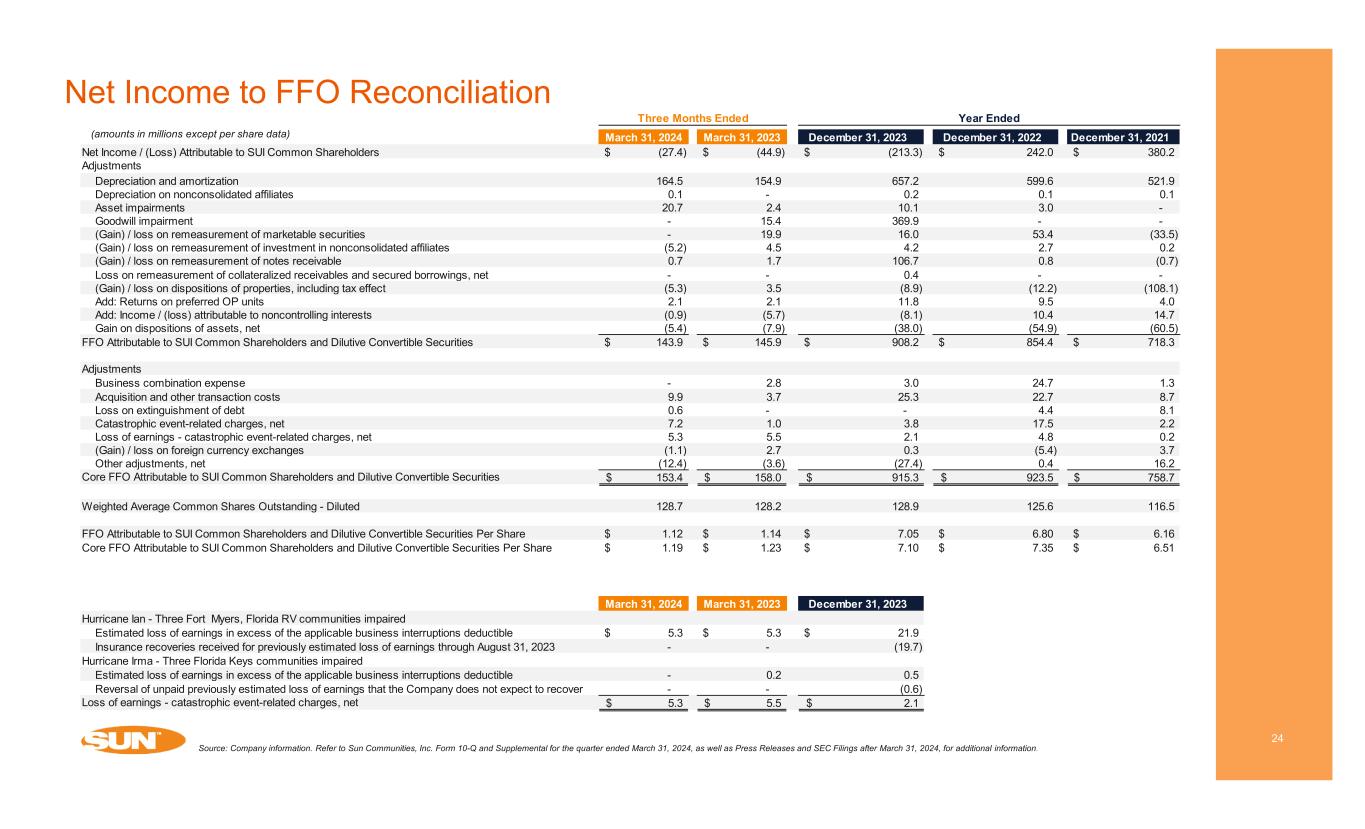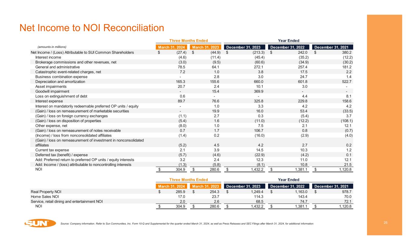 Net Income to FFO Reconciliation 24 Source: Company information. Refer to Sun Communities, Inc. Form 10-Q and Supplemental for the quarter ended March 31, 2024, as well as Press Releases and SEC Filings after March 31, 2024, for additional information. (amounts in millions except per share data) March 31, 2024 March 31, 2023 December 31, 2023 December 31, 2022 December 31, 2021 Net Income / (Loss) Attributable to SUI Common Shareholders (27.4)$ (44.9)$ (213.3)$ 242.0$ 380.2$ Adjustments Depreciation and amortization 164.5 154.9 657.2 599.6 521.9 Depreciation on nonconsolidated affiliates 0.1 - 0.2 0.1 0.1 Asset impairments 20.7 2.4 10.1 3.0 - Goodwill impairment - 15.4 369.9 - - (Gain) / loss on remeasurement of marketable securities - 19.9 16.0 53.4 (33.5) (Gain) / loss on remeasurement of investment in nonconsolidated affiliates (5.2) 4.5 4.2 2.7 0.2 (Gain) / loss on remeasurement of notes receivable 0.7 1.7 106.7 0.8 (0.7) Loss on remeasurement of collateralized receivables and secured borrowings, net - - 0.4 - - (Gain) / loss on dispositions of properties, including tax effect (5.3) 3.5 (8.9) (12.2) (108.1) Add: Returns on preferred OP units 2.1 2.1 11.8 9.5 4.0 Add: Income / (loss) attributable to noncontrolling interests (0.9) (5.7) (8.1) 10.4 14.7 Gain on dispositions of assets, net (5.4) (7.9) (38.0) (54.9) (60.5) FFO Attributable to SUI Common Shareholders and Dilutive Convertible Securities 143.9$ 145.9$ 908.2$ 854.4$ 718.3$ Adjustments Business combination expense - 2.8 3.0 24.7 1.3 Acquisition and other transaction costs 9.9 3.7 25.3 22.7 8.7 Loss on extinguishment of debt 0.6 - - 4.4 8.1 Catastrophic event-related charges, net 7.2 1.0 3.8 17.5 2.2 Loss of earnings - catastrophic event-related charges, net 5.3 5.5 2.1 4.8 0.2 (Gain) / loss on foreign currency exchanges (1.1) 2.7 0.3 (5.4) 3.7 Other adjustments, net (12.4) (3.6) (27.4) 0.4 16.2 Core FFO Attributable to SUI Common Shareholders and Dilutive Convertible Securities 153.4$ 158.0$ 915.3$ 923.5$ 758.7$ Weighted Average Common Shares Outstanding - Diluted 128.7 128.2 128.9 125.6 116.5 FFO Attributable to SUI Common Shareholders and Dilutive Convertible Securities Per Share 1.12$ 1.14$ 7.05$ 6.80$ 6.16$ Core FFO Attributable to SUI Common Shareholders and Dilutive Convertible Securities Per Share 1.19$ 1.23$ 7.10$ 7.35$ 6.51$ March 31, 2024 March 31, 2023 December 31, 2023 Hurricane Ian - Three Fort Myers, Florida RV communities impaired Estimated loss of earnings in excess of the applicable business interruptions deductible 5.3$ 5.3$ 21.9$ Insurance recoveries received for previously estimated loss of earnings through August 31, 2023 - - (19.7) Hurricane Irma - Three Florida Keys communities impaired Estimated loss of earnings in excess of the applicable business interruptions deductible - 0.2 0.5 Reversal of unpaid previously estimated loss of earnings that the Company does not expect to recover - - (0.6) Loss of earnings - catastrophic event-related charges, net 5.3$ 5.5$ 2.1$ Year EndedThree Months Ended