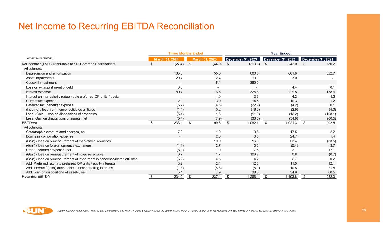 Net Income to NOI Reconciliation 25 (amounts in millions) Source: Company information. Refer to Sun Communities, Inc. Form 10-Q and Supplemental for the quarter ended March 31, 2024, as well as Press Releases and SEC Filings after March 31, 2024, for additional information. March 31, 2024 March 31, 2023 December 31, 2023 December 31, 2022 December 31, 2021 Net Income / (Loss) Attributable to SUI Common Shareholders (27.4)$ (44.9)$ (213.3)$ 242.0$ 380.2$ Interest income (4.6) (11.4) (45.4) (35.2) (12.2) Brokerage commissions and other revenues, net (3.0) (9.5) (60.6) (34.9) (30.2) General and administrative 78.5 64.1 272.1 257.4 181.2 Catastrophic event-related charges, net 7.2 1.0 3.8 17.5 2.2 Business combination expense - 2.8 3.0 24.7 1.4 Depreciation and amortization 165.3 155.6 660.0 601.8 522.7 Asset impairments 20.7 2.4 10.1 3.0 - Goodwill impairment - 15.4 369.9 - - Loss on extinguishment of debt 0.6 - - 4.4 8.1 Interest expense 89.7 76.6 325.8 229.8 158.6 Interest on mandatorily redeemable preferred OP units / equity - 1.0 3.3 4.2 4.2 (Gain) / loss on remeasurement of marketable securities - 19.9 16.0 53.4 (33.5) (Gain) / loss on foreign currency exchanges (1.1) 2.7 0.3 (5.4) 3.7 (Gain) / loss on disposition of properties (5.4) 1.6 (11.0) (12.2) (108.1) Other expense, net (8.0) 1.0 7.5 2.1 12.1 (Gain) / loss on remeasurement of notes receivable 0.7 1.7 106.7 0.8 (0.7) (Income) / loss from nonconsolidated affiliates (1.4) 0.2 (16.0) (2.9) (4.0) (Gain) / loss on remeasurement of investment in nonconsolidated affiliates (5.2) 4.5 4.2 2.7 0.2 Current tax expense 2.1 3.9 14.5 10.3 1.2 Deferred tax (benefit) / expense (5.7) (4.6) (22.9) (4.2) 0.1 Add: Preferred return to preferred OP units / equity interests 3.2 2.4 12.3 11.0 12.1 Add: Income / (loss) attributable to noncontrolling interests (1.3) (5.8) (8.1) 10.8 21.5 NOI 304.9$ 280.6$ 1,432.2$ 1,381.1$ 1,120.8$ March 31, 2024 March 31, 2023 December 31, 2023 December 31, 2022 December 31, 2021 Real Property NOI 285.9$ 254.3$ 1,249.4$ 1,163.0$ 978.7$ Home Sales NOI 17.0 23.7 114.3 143.4 70.0 Service, retail dining and entertainment NOI 2.0 2.6 68.5 74.7 72.1 NOI 304.9$ 280.6$ 1,432.2$ 1,381.1$ 1,120.8$ Year Ended Year Ended Three Months Ended Three Months Ended