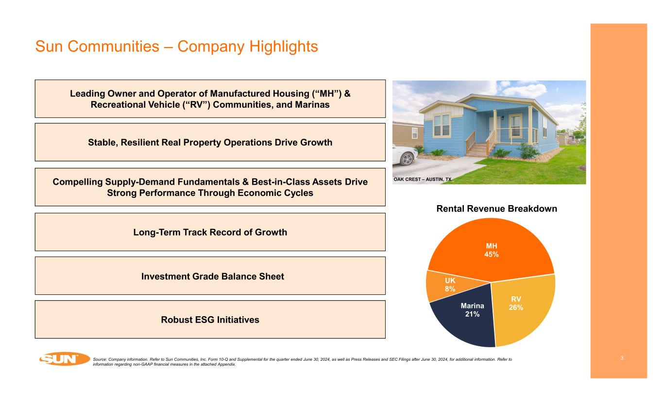 Cautionary Statement Regarding Forward-looking Statements 2 This presentation has been prepared for informational purposes only from information supplied by Sun Communities, Inc., referred to herein as “we,” “our,” “Sun,” and “the Company,” and from third-party sources indicated herein. Such third-party information has not been independently verified. Sun makes no representation or warranty, expressed or implied, as to the accuracy or completeness of such information. This presentation contains various “forward-looking statements” within the meaning of the United States Securities Act of 1933, as amended, and the United States Securities Exchange Act of 1934, as amended, and the Company intends that such forward- looking statements will be subject to the safe harbors created thereby. For this purpose, any statements contained in this presentation that relate to expectations, beliefs, projections, future plans and strategies, trends or prospective events or developments and similar expressions concerning matters that are not historical facts are deemed to be forward-looking statements. Words such as “forecasts,” “intends,” “intend,” “intended,” “goal,” “estimate,” “estimates,” “expects,” “expect,” “expected,” “project,” “projected,” “projections,” “plans,” “predicts,” “potential,” “seeks,” “anticipates,” “anticipated,” “should,” “could,” “may,” “will,” “designed to,” “foreseeable future,” “believe,” “believes,” “scheduled,” “guidance,” “target” and similar expressions are intended to identify forward-looking statements, although not all forward-looking statements contain these words. These forward-looking statements reflect the Company’s current views with respect to future events and financial performance, but involve known and unknown risks and uncertainties, both general and specific to the matters discussed in this presentation, some of which are beyond the Company’s control. These risks and uncertainties and other factors may cause the Company’s actual results to be materially different from any future results expressed or implied by such forward-looking statements. In addition to the risks described under “Risk Factors” contained in the Company’s Annual Report on Form 10-K for the year ended December 31, 2023, and in the Company’s other filings with the Securities and Exchange Commission, from time to time, such risks, uncertainties and other factors include, but are not limited to: Changes in general economic conditions, including inflation, deflation, energy costs, the real estate industry and the markets within which the Company operates; Difficulties in the Company’s ability to evaluate, finance, complete and integrate acquisitions, developments and expansions successfully; The Company’s liquidity and refinancing demands; The Company’s ability to obtain or refinance maturing debt; The Company’s ability to maintain compliance with covenants contained in its debt facilities and its unsecured notes; Availability of capital; Outbreaks of disease and related restrictions on business operations; Changes in foreign currency exchange rates, including between the U.S. dollar and each of the Canadian dollar, Australian dollar and Pound sterling; The Company’s ability to maintain rental rates and occupancy levels; The Company’s ability to maintain effective internal control over financial reporting and disclosure controls and procedures; The Company's remediation plan and its ability to remediate the material weaknesses in its internal control over financial reporting; Expectations regarding the amount or frequency of impairment losses, including as a result of the write-down of intangible assets, including goodwill; Increases in interest rates and operating costs, including insurance premiums and real estate taxes; Risks related to natural disasters such as hurricanes, earthquakes, floods, droughts and wildfires; General volatility of the capital markets and the market price of shares of the Company’s capital stock; The Company’s ability to maintain its status as a REIT; Changes in real estate and zoning laws and regulations; Legislative or regulatory changes, including changes to laws governing the taxation of REITs; Litigation, judgments or settlements, including costs associated with prosecuting or defending claims and any adverse outcomes; Competitive market forces; The ability of purchasers of manufactured homes and boats to obtain financing; and The level of repossessions by manufactured home and boat lenders. Readers are cautioned not to place undue reliance on these forward-looking statements, which speak only as of the date the statement was made. The Company undertakes no obligation to publicly update or revise any forward-looking statements included in this presentation, whether as a result of new information, future events, changes in the Company’s expectations or otherwise, except as required by law. Although the Company believes that the expectations reflected in the forward-looking statements are reasonable, the Company cannot guarantee future results, levels of activity, performance or achievements. All written and oral forward-looking statements attributable to the Company or persons acting on the Company’s behalf are qualified in their entirety by these cautionary statements. CAUTIONARY STATEMENT REGARDING GUIDANCE This presentation includes certain estimates and assumptions included in the Company’s financial, earnings and operational guidance, as presented in its earnings press release and supplemental operating and financial data dated July 31, 2024. These estimates and assumptions represent a range of possible outcomes and may differ materially from actual results. These estimates include contributions from all acquisitions, dispositions and capital markets activity completed through July 31, 2