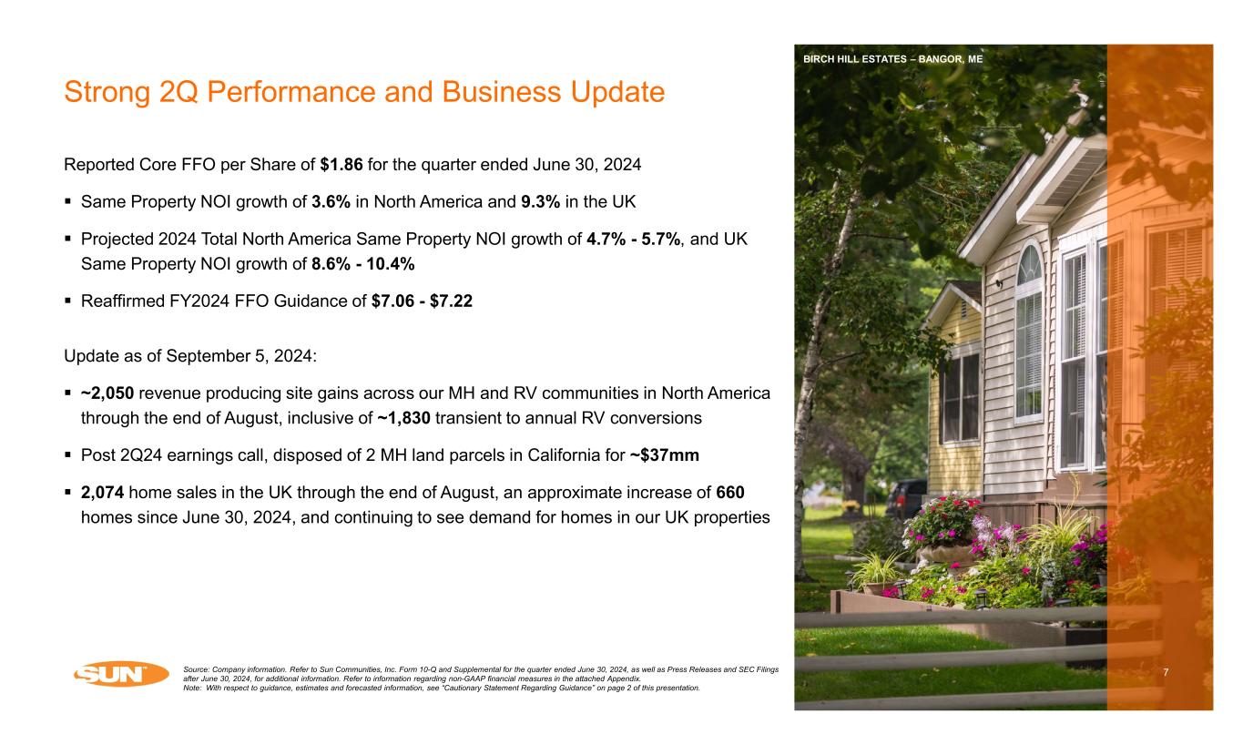 7.7% 9.1% 7.1% 6.9% 6.7% 7.3% 4.0% 11.2% 5.8% 7.3% 4.7% 2014 2015 2016 2017 2018 2019 2020 2021 2022 2023 2024E 2.0% 2.9% 3.1% 4.2% 5.4% 6.1% 5.4% 4.8% 7.6% 8.7% 6.5% 2014 2015 2016 2017 2018 2019 2020 2021 2022 2023 2024E CPI-U 3.4% 3.4% 3.3% 3.6% 4.0% 4.2% 3.4% 3.4% 4.6% 6.4% 5.4% 2014 2015 2016 2017 2018 2019 2020 2021 2022 2023 2024E CPI-U Robust Fundamentals Continue to Drive Performance 6 5.6% North America same property NOI growth in first six months of 2024; expect 4.7% - 5.7% growth in 2024 to be driven by rental rate increases and occupancy gains Consistent annual rental rate increases exceed expected inflationary cost pressures o Expected average rental rate increases: North America MH 5.4%, Annual RV 6.5%, Marina 5.6% and UK 7.1% Occupancy gains, including strategic focus on converting transient guests into annual residents, increase our stream of stable revenue and improves operational efficiencies o Since the start of 2020, we have completed nearly 8,700 conversions through August 31, 2024, and we intend to continue driving conversions Steady, Organic Growth MH Average Rental Rate Increases RV Average Rental Rate Increases Occupancy Same Property NOI Growth 10-Year Actual Average Same Property NOI Growth: 7.3% 10-Year Actual Average Rental Rate Growth: 4.0% 10-Year Actual Average Rental Rate Growth: 5.0% Source: Company information and U.S. Bureau of Labor Statistics. Refer to Sun Communities, Inc. Form 10-Q and Supplemental for the quarter ended June 30, 2024, as well as Press Releases and SEC Filings after June 30, 2024, for additional information. Refer to information regarding non-GAAP financial measures in the attached Appendix. Note: With respect to guidance, estimates and forecasted information, see “Cautionary Statement Regarding Guidance” on page 2 of this presentation. 1) Preliminary 2024 rental rate increases. CPI-U 12-month percentage change as of July 2024. 2) Same Property MH and Annual RV occupancy, adjusted for recently completed but vacant expansion sites. 5.7% (1) (1) 93.2% 95.9% 96.6% 97.3% 98.0% 98.4% 98.8% 98.9% 98.6% 98.9% 98.7% 2014 2015 2016 2017 2018 2019 2020 2021 2022 2023 2Q24 Same Property Occupancy(2)