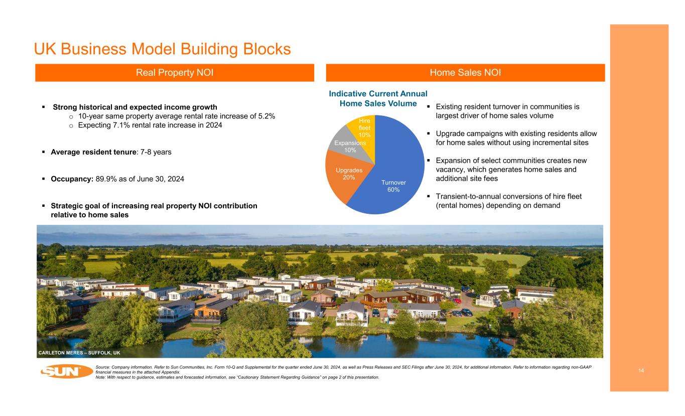 Compelling Supply-Demand Fundamentals 13 Manufactured Housing (MH) - UK Source: Company information, Wall Street Research and Zillow. Refer to Sun Communities, Inc. Form 10-Q and Supplemental for the quarter ended June 30, 2024, as well as Press Releases and SEC Filings after June 30, 2024, for additional information. Refer to information regarding non-GAAP financial measures in the attached Appendix. 1) Includes pre-acquisition home sales volume from the original Park Holidays portfolio acquired on April 8, 2022, and other subsequent acquisitions, as well as home sales at Sandy Bay. 2) As of August 31, 2024. Includes Sandy Bay. FELIXSTOWE BEACH – SUFFOLK, UK Irreplaceable coastal ‘destination’ locations that are short drives from London and other urban locations Numerous barriers to entry including strict regulations and scarcity of land UK holiday community market is highly fragmented Brexit and other macroeconomic structural factors create demand for domestic vacationing throughout UK Majority of Sun’s holiday parks are owner-occupied on 20+ year licenses subject to annual rent increases Average resident tenure 7 - 8 years Strong resident retention in 2023 led to increased real property NOI guidance for UK operations DemandSupply 1,174 1,116 1,299 1,357 1,423 1,618 1,632 1,930 1,921 2,012 2,166 2,131 2,194 2,066 2,368 3,168 2,857 2,074 2007 2008 2009 2010 2011 2012 2013 2014 2015 2016 2017 2018 2019 2020 2021 2022 2023 2024 YTD Global Financial Crisis Brexit uncertainty COVID-19 Brexit vote Resilient Through Economic Uncertainty Holiday Home Sales (number of units) (1) (2)