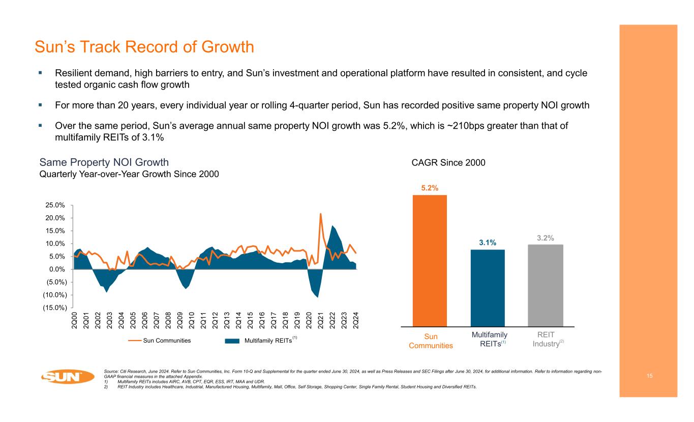 Sun’s Track Record of Growth 15 Multifamily REITsSun Communities Resilient demand, high barriers to entry, and Sun’s investment and operational platform have resulted in consistent, and cycle tested organic cash flow growth For more than 20 years, every individual year or rolling 4-quarter period, Sun has recorded positive same property NOI growth Over the same period, Sun’s average annual same property NOI growth was 5.2%, which is ~210bps greater than that of multifamily REITs of 3.1% Same Property NOI Growth Quarterly Year-over-Year Growth Since 2000 Source: Citi Research, June 2024. Refer to Sun Communities, Inc. Form 10-Q and Supplemental for the quarter ended June 30, 2024, as well as Press Releases and SEC Filings after June 30, 2024, for additional information. Refer to information regarding non- GAAP financial measures in the attached Appendix. 1) Multifamily REITs includes AIRC, AVB, CPT, EQR, ESS, IRT, MAA and UDR. 2) REIT Industry includes Healthcare, Industrial, Manufactured Housing, Multifamily, Mall, Office, Self Storage, Shopping Center, Single Family Rental, Student Housing and Diversified REITs. (1) CAGR Since 2000 Sun Communities Multifamily REITs REIT Industry(1) (2) (15.0%) (10.0%) (5.0%) 0.0% 5.0% 10.0% 15.0% 20.0% 25.0% 5.2% 3.1% 3.2%