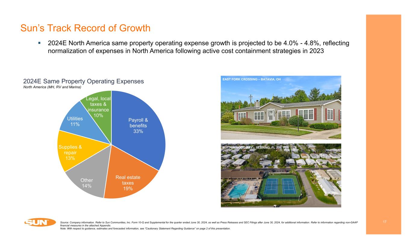 Sun’s Strong Track Record of Internal Growth 16 Multiple Levers Drive Resilient FFO and Cash Flow Growth Growth Levers Potential Annual Revenue Growth / Contribution Contractual Rent Increases - 6.4% weighted average rate increase for 2023 - Over 90% MH sites “market rent” or tied to CPI Occupancy Gains - ~97% MH Occupancy - Over 4K current sites available for occupancy gains - ~900 expansion and development sites delivered in 2023 and through 2Q24 Transient to Annual RV Conversions - ~1,700 average yearly converted sites(1) - Over 1,900 transient to annual RV conversions for trailing twelve months - 40% - 50% of 26K transient sites in North America are candidates for conversion Source: Company information. Refer to Sun Communities, Inc. Form 10-Q and Supplemental for the quarter ended June 30, 2024, as well as Press Releases and SEC Filings after June 30, 2024, for additional information. Refer to information regarding non-GAAP financial measures in the attached Appendix. Note: With respect to guidance, estimates and forecasted information, see “Cautionary Statement Regarding Guidance” on page 2 of this presentation. 1) 2020 – 2023 average. REGENCY HEIGHTS – CLEARWATER, FL