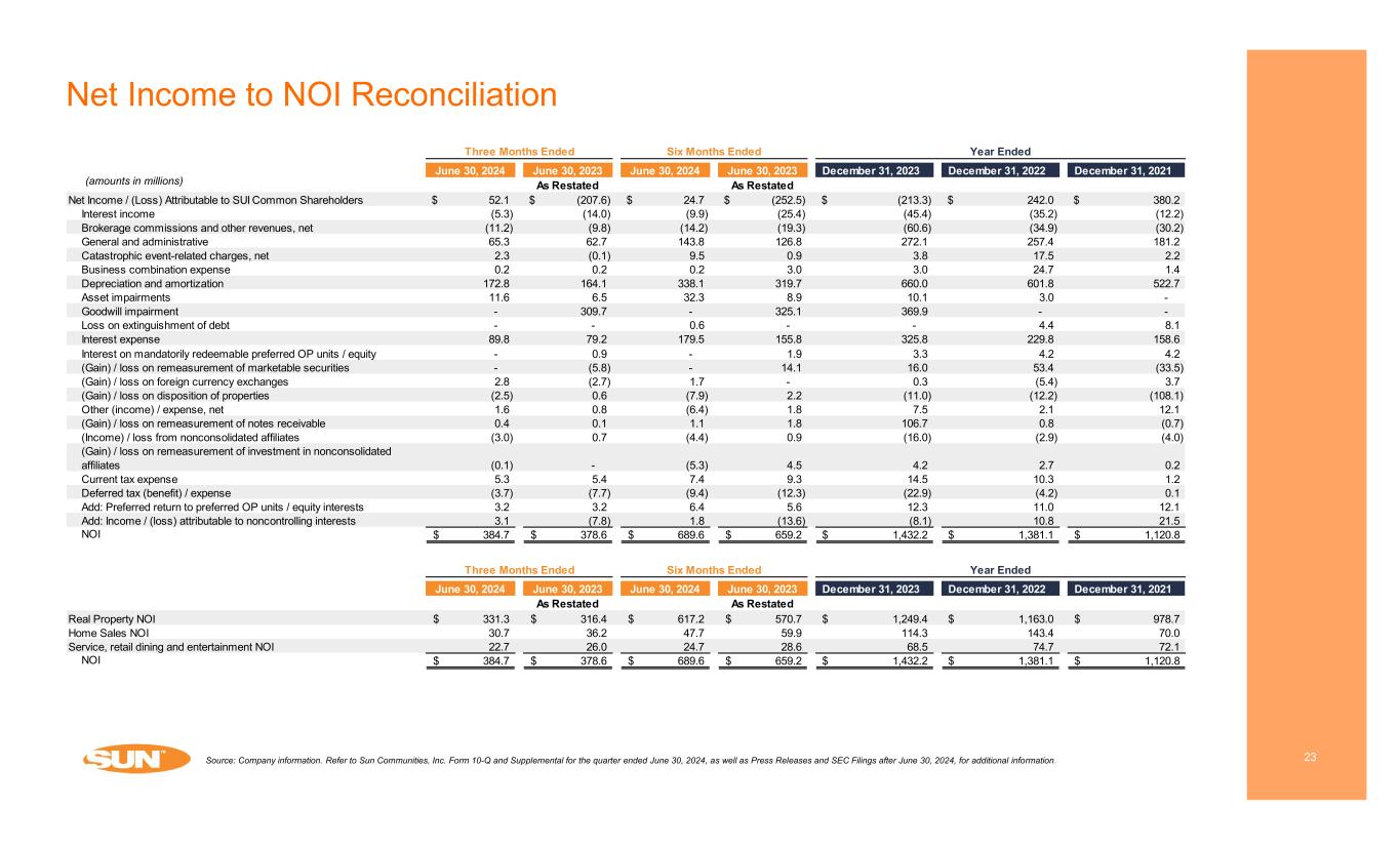 June 30, 2024 June 30, 2023 June 30, 2024 June 30, 2023 December 31, 2023 December 31, 2022 December 31, 2021 As Restated As Restated Net Income / (Loss) Attributable to SUI Common Shareholders 52.1$ (207.6)$ 24.7$ (252.5)$ (213.3)$ 242.0$ 380.2$ Interest income (5.3) (14.0) (9.9) (25.4) (45.4) (35.2) (12.2) Brokerage commissions and other revenues, net (11.2) (9.8) (14.2) (19.3) (60.6) (34.9) (30.2) General and administrative 65.3 62.7 143.8 126.8 272.1 257.4 181.2 Catastrophic event-related charges, net 2.3 (0.1) 9.5 0.9 3.8 17.5 2.2 Business combination expense 0.2 0.2 0.2 3.0 3.0 24.7 1.4 Depreciation and amortization 172.8 164.1 338.1 319.7 660.0 601.8 522.7 Asset impairments 11.6 6.5 32.3 8.9 10.1 3.0 - Goodwill impairment - 309.7 - 325.1 369.9 - - Loss on extinguishment of debt - - 0.6 - - 4.4 8.1 Interest expense 89.8 79.2 179.5 155.8 325.8 229.8 158.6 Interest on mandatorily redeemable preferred OP units / equity - 0.9 - 1.9 3.3 4.2 4.2 (Gain) / loss on remeasurement of marketable securities - (5.8) - 14.1 16.0 53.4 (33.5) (Gain) / loss on foreign currency exchanges 2.8 (2.7) 1.7 - 0.3 (5.4) 3.7 (Gain) / loss on disposition of properties (2.5) 0.6 (7.9) 2.2 (11.0) (12.2) (108.1) Other (income) / expense, net 1.6 0.8 (6.4) 1.8 7.5 2.1 12.1 (Gain) / loss on remeasurement of notes receivable 0.4 0.1 1.1 1.8 106.7 0.8 (0.7) (Income) / loss from nonconsolidated affiliates (3.0) 0.7 (4.4) 0.9 (16.0) (2.9) (4.0) (Gain) / loss on remeasurement of investment in nonconsolidated affiliates (0.1) - (5.3) 4.5 4.2 2.7 0.2 Current tax expense 5.3 5.4 7.4 9.3 14.5 10.3 1.2 Deferred tax (benefit) / expense (3.7) (7.7) (9.4) (12.3) (22.9) (4.2) 0.1 Add: Preferred return to preferred OP units / equity interests 3.2 3.2 6.4 5.6 12.3 11.0 12.1 Add: Income / (loss) attributable to noncontrolling interests 3.1 (7.8) 1.8 (13.6) (8.1) 10.8 21.5 NOI 384.7$ 378.6$ 689.6$ 659.2$ 1,432.2$ 1,381.1$ 1,120.8$ June 30, 2024 June 30, 2023 June 30, 2024 June 30, 2023 December 31, 2023 December 31, 2022 December 31, 2021 As Restated As Restated Real Property NOI 331.3$ 316.4$ 617.2$ 570.7$ 1,249.4$ 1,163.0$ 978.7$ Home Sales NOI 30.7 36.2 47.7 59.9 114.3 143.4 70.0 Service, retail dining and entertainment NOI 22.7 26.0 24.7 28.6 68.5 74.7 72.1 NOI 384.7$ 378.6$ 689.6$ 659.2$ 1,432.2$ 1,381.1$ 1,120.8$ Year Ended Year Ended Three Months Ended Three Months Ended Six Months Ended Six Months Ended Net Income to NOI Reconciliation 23 (amounts in millions) Source: Company information. Refer to Sun Communities, Inc. Form 10-Q and Supplemental for the quarter ended June 30, 2024, as well as Press Releases and SEC Filings after June 30, 2024, for additional information.