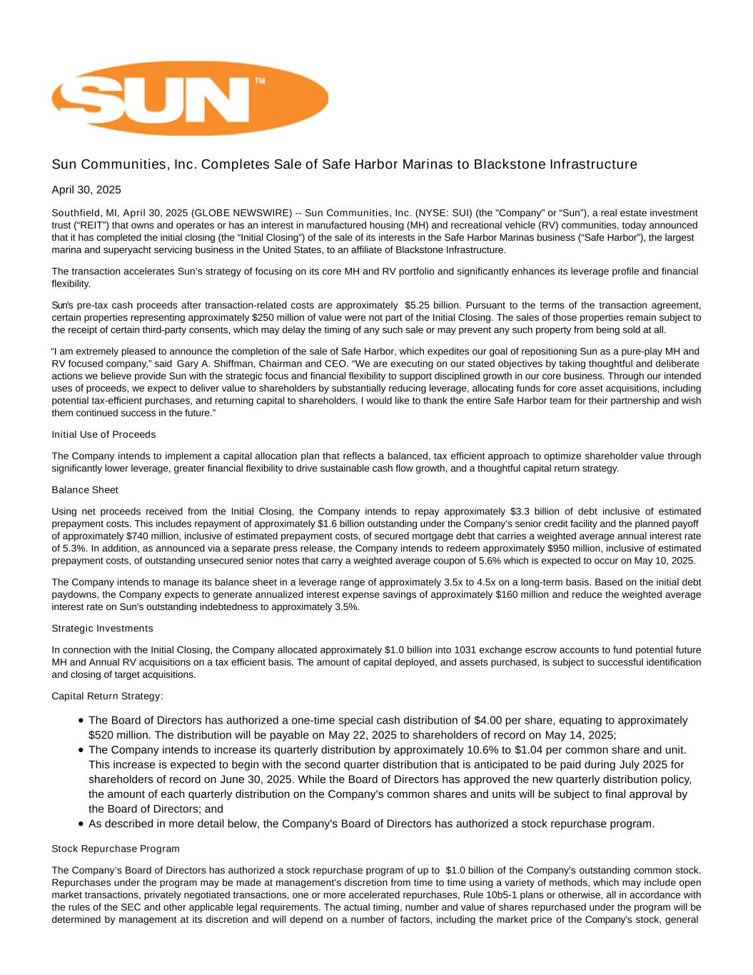 Sun Communities, Inc. Completes Sale of Safe Harbor Marinas to Blackstone Infrastructure April 30, 2025 Southfield, MI, April 30, 2025 (GLOBE NEWSWIRE) -- Sun Communities, Inc. (NYSE: SUI) (the "Company" or “Sun”), a real estate investment trust (“REIT”) that owns and operates or has an interest in manufactured housing (MH) and recreational vehicle (RV) communities, today announced that it has completed the initial closing (the “Initial Closing”) of the sale of its interests in the Safe Harbor Marinas business (“Safe Harbor”), the largest marina and superyacht servicing business in the United States, to an affiliate of Blackstone Infrastructure. The transaction accelerates Sun’s strategy of focusing on its core MH and RV portfolio and significantly enhances its leverage profile and financial flexibility. Sun’s pre-tax cash proceeds after transaction-related costs are approximately $5.25 billion. Pursuant to the terms of the transaction agreement, certain properties representing approximately $250 million of value were not part of the Initial Closing. The sales of those properties remain subject to the receipt of certain third-party consents, which may delay the timing of any such sale or may prevent any such property from being sold at all. “I am extremely pleased to announce the completion of the sale of Safe Harbor, which expedites our goal of repositioning Sun as a pure-play MH and RV focused company,” said Gary A. Shiffman, Chairman and CEO. “We are executing on our stated objectives by taking thoughtful and deliberate actions we believe provide Sun with the strategic focus and financial flexibility to support disciplined growth in our core business. Through our intended uses of proceeds, we expect to deliver value to shareholders by substantially reducing leverage, allocating funds for core asset acquisitions, including potential tax-efficient purchases, and returning capital to shareholders. I would like to thank the entire Safe Harbor team for their partnership and wish them continued success in the future.” Initial Use of Proceeds The Company intends to implement a capital allocation plan that reflects a balanced, tax efficient approach to optimize shareholder value through significantly lower leverage, greater financial flexibility to drive sustainable cash flow growth, and a thoughtful capital return strategy. Balance Sheet Using net proceeds received from the Initial Closing, the Company intends to repay approximately $3.3 billion of debt inclusive of estimated prepayment costs. This includes repayment of approximately $1.6 billion outstanding under the Company’s senior credit facility and the planned payoff of approximately $740 million, inclusive of estimated prepayment costs, of secured mortgage debt that carries a weighted average annual interest rate of 5.3%. In addition, as announced via a separate press release, the Company intends to redeem approximately $950 million, inclusive of estimated prepayment costs, of outstanding unsecured senior notes that carry a weighted average coupon of 5.6% which is expected to occur on May 10, 2025. The Company intends to manage its balance sheet in a leverage range of approximately 3.5x to 4.5x on a long-term basis. Based on the initial debt paydowns, the Company expects to generate annualized interest expense savings of approximately $160 million and reduce the weighted average interest rate on Sun's outstanding indebtedness to approximately 3.5%. Strategic Investments In connection with the Initial Closing, the Company allocated approximately $1.0 billion into 1031 exchange escrow accounts to fund potential future MH and Annual RV acquisitions on a tax efficient basis. The amount of capital deployed, and assets purchased, is subject to successful identification and closing of target acquisitions. Capital Return Strategy: The Board of Directors has authorized a one-time special cash distribution of $4.00 per share, equating to approximately $520 million. The distribution will be payable on May 22, 2025 to shareholders of record on May 14, 2025; The Company intends to increase its quarterly distribution by approximately 10.6% to $1.04 per common share and unit. This increase is expected to begin with the second quarter distribution that is anticipated to be paid during July 2025 for shareholders of record on June 30, 2025. While the Board of Directors has approved the new quarterly distribution policy, the amount of each quarterly distribution on the Company's common shares and units will be subject to final approval by the Board of Directors; and As described in more detail below, the Company's Board of Directors has authorized a stock repurchase program. Stock Repurchase Program The Company’s Board of Directors has authorized a stock repurchase program of up to $1.0 billion of the Company's outstanding common stock. Repurchases under the program may be made at management's discretion from time to time using a variety of methods, which may include open market transactions, privately negotiated transactions, one or more accelerated repurchases, Rule 10b5-1 plans or otherwise, all in accordance with the rules of the SEC and other applicable legal requirements. The actual timing, number and value of shares repurchased under the program will be determined by management at its discretion and will depend on a number of factors, including the market price of the Company’s stock, general