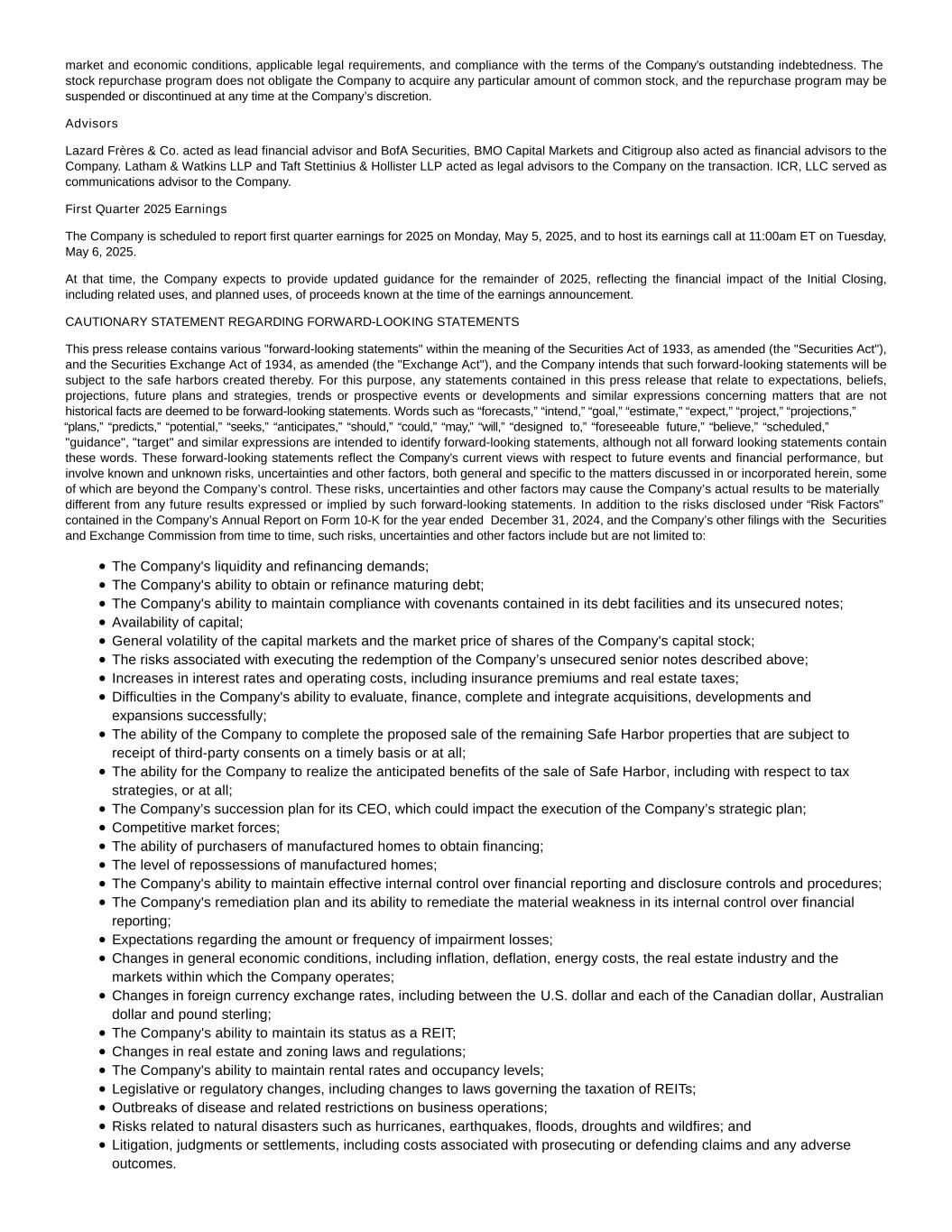 market and economic conditions, applicable legal requirements, and compliance with the terms of the Company’s outstanding indebtedness. The stock repurchase program does not obligate the Company to acquire any particular amount of common stock, and the repurchase program may be suspended or discontinued at any time at the Company’s discretion. Advisors Lazard Frères & Co. acted as lead financial advisor and BofA Securities, BMO Capital Markets and Citigroup also acted as financial advisors to the Company. Latham & Watkins LLP and Taft Stettinius & Hollister LLP acted as legal advisors to the Company on the transaction. ICR, LLC served as communications advisor to the Company. First Quarter 2025 Earnings The Company is scheduled to report first quarter earnings for 2025 on Monday, May 5, 2025, and to host its earnings call at 11:00am ET on Tuesday, May 6, 2025. At that time, the Company expects to provide updated guidance for the remainder of 2025, reflecting the financial impact of the Initial Closing, including related uses, and planned uses, of proceeds known at the time of the earnings announcement. CAUTIONARY STATEMENT REGARDING FORWARD-LOOKING STATEMENTS This press release contains various "forward-looking statements" within the meaning of the Securities Act of 1933, as amended (the "Securities Act"), and the Securities Exchange Act of 1934, as amended (the "Exchange Act"), and the Company intends that such forward-looking statements will be subject to the safe harbors created thereby. For this purpose, any statements contained in this press release that relate to expectations, beliefs, projections, future plans and strategies, trends or prospective events or developments and similar expressions concerning matters that are not historical facts are deemed to be forward-looking statements. Words such as “forecasts,” “intend,” “goal,” “estimate,” “expect,” “project,” “projections,” “plans,” “predicts,” “potential,” “seeks,” “anticipates,” “should,” “could,” “may,” “will,” “designed to,” “foreseeable future,” “believe,” “scheduled,” "guidance", "target" and similar expressions are intended to identify forward-looking statements, although not all forward looking statements contain these words. These forward-looking statements reflect the Company’s current views with respect to future events and financial performance, but involve known and unknown risks, uncertainties and other factors, both general and specific to the matters discussed in or incorporated herein, some of which are beyond the Company’s control. These risks, uncertainties and other factors may cause the Company’s actual results to be materially different from any future results expressed or implied by such forward-looking statements. In addition to the risks disclosed under “Risk Factors” contained in the Company’s Annual Report on Form 10-K for the year ended December 31, 2024, and the Company’s other filings with the Securities and Exchange Commission from time to time, such risks, uncertainties and other factors include but are not limited to: The Company's liquidity and refinancing demands; The Company's ability to obtain or refinance maturing debt; The Company's ability to maintain compliance with covenants contained in its debt facilities and its unsecured notes; Availability of capital; General volatility of the capital markets and the market price of shares of the Company's capital stock; The risks associated with executing the redemption of the Company’s unsecured senior notes described above; Increases in interest rates and operating costs, including insurance premiums and real estate taxes; Difficulties in the Company's ability to evaluate, finance, complete and integrate acquisitions, developments and expansions successfully; The ability of the Company to complete the proposed sale of the remaining Safe Harbor properties that are subject to receipt of third-party consents on a timely basis or at all; The ability for the Company to realize the anticipated benefits of the sale of Safe Harbor, including with respect to tax strategies, or at all; The Company’s succession plan for its CEO, which could impact the execution of the Company’s strategic plan; Competitive market forces; The ability of purchasers of manufactured homes to obtain financing; The level of repossessions of manufactured homes; The Company's ability to maintain effective internal control over financial reporting and disclosure controls and procedures; The Company's remediation plan and its ability to remediate the material weakness in its internal control over financial reporting; Expectations regarding the amount or frequency of impairment losses; Changes in general economic conditions, including inflation, deflation, energy costs, the real estate industry and the markets within which the Company operates; Changes in foreign currency exchange rates, including between the U.S. dollar and each of the Canadian dollar, Australian dollar and pound sterling; The Company's ability to maintain its status as a REIT; Changes in real estate and zoning laws and regulations; The Company's ability to maintain rental rates and occupancy levels; Legislative or regulatory changes, including changes to laws governing the taxation of REITs; Outbreaks of disease and related restrictions on business operations; Risks related to natural disasters such as hurricanes, earthquakes, floods, droughts and wildfires; and Litigation, judgments or settlements, including costs associated with prosecuting or defending claims and any adverse outcomes.