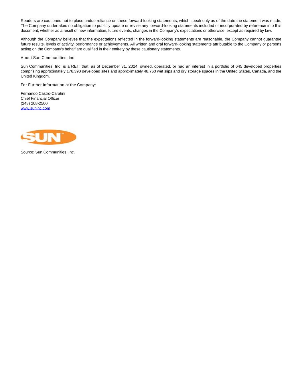 Readers are cautioned not to place undue reliance on these forward-looking statements, which speak only as of the date the statement was made. The Company undertakes no obligation to publicly update or revise any forward-looking statements included or incorporated by reference into this document, whether as a result of new information, future events, changes in the Company's expectations or otherwise, except as required by law. Although the Company believes that the expectations reflected in the forward-looking statements are reasonable, the Company cannot guarantee future results, levels of activity, performance or achievements. All written and oral forward-looking statements attributable to the Company or persons acting on the Company's behalf are qualified in their entirety by these cautionary statements. About Sun Communities, Inc. Sun Communities, Inc. is a REIT that, as of December 31, 2024, owned, operated, or had an interest in a portfolio of 645 developed properties comprising approximately 176,390 developed sites and approximately 48,760 wet slips and dry storage spaces in the United States, Canada, and the United Kingdom. For Further Information at the Company: Fernando Castro-Caratini Chief Financial Officer (248) 208-2500 www.suninc.com Source: Sun Communities, Inc.