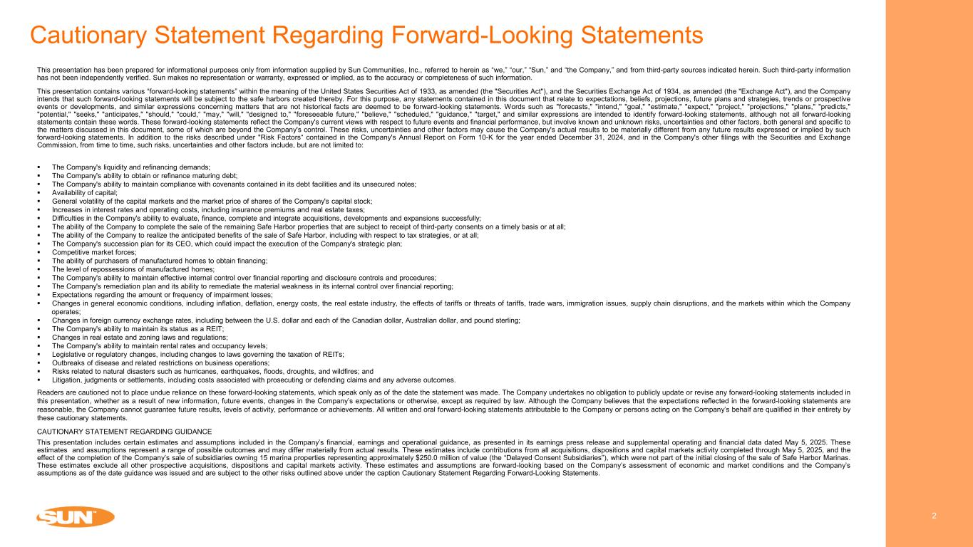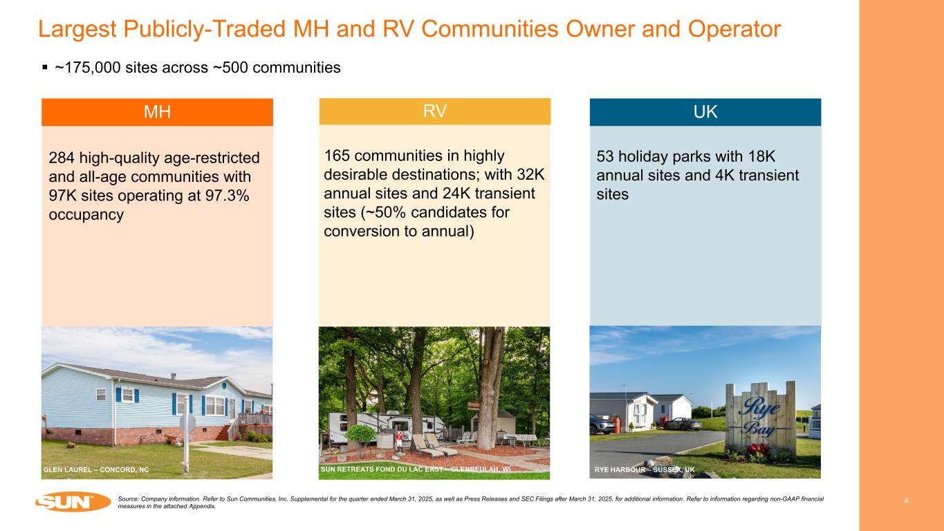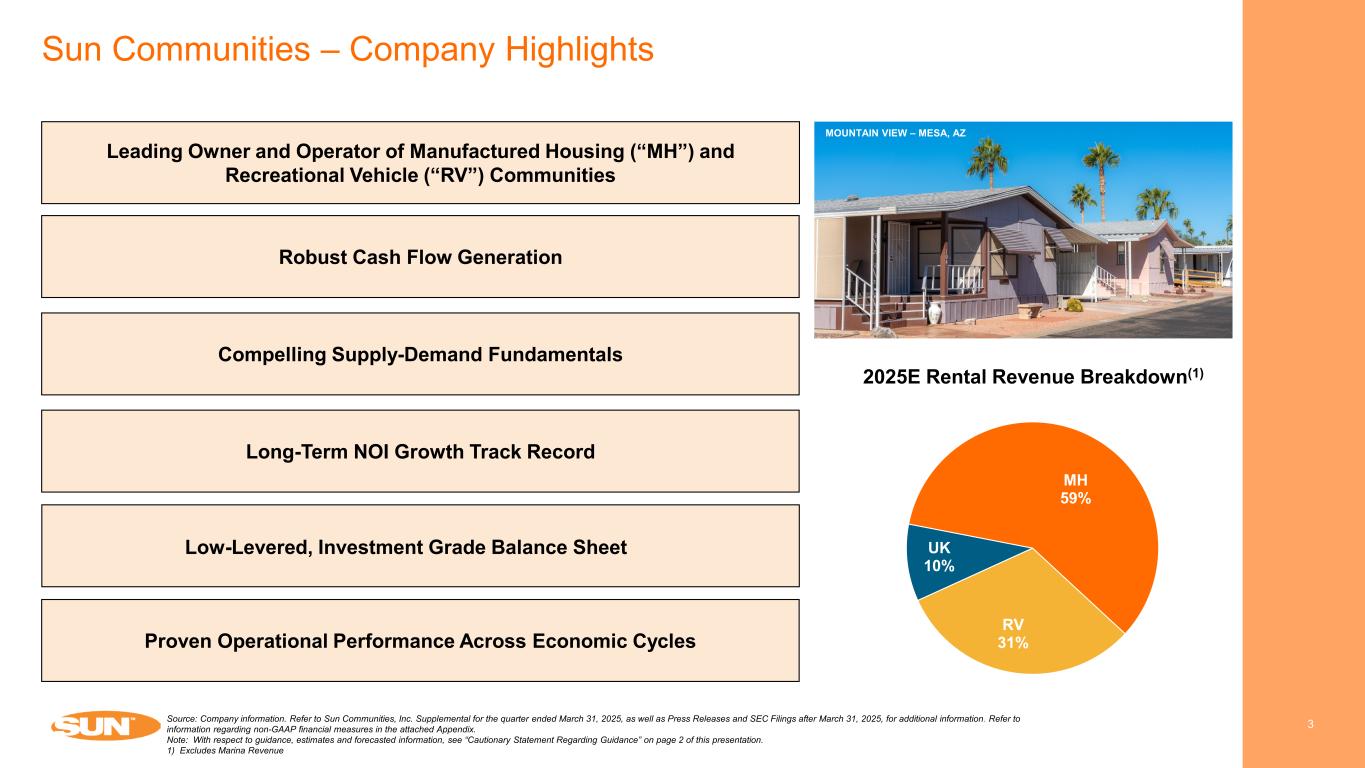 Cautionary Statement Regarding Forward-Looking Statements 2 This presentation has been prepared for informational purposes only from information supplied by Sun Communities, Inc., referred to herein as “we,” “our,” “Sun,” and “the Company,” and from third-party sources indicated herein. Such third-party information has not been independently verified. Sun makes no representation or warranty, expressed or implied, as to the accuracy or completeness of such information. This presentation contains various “forward-looking statements” within the meaning of the United States Securities Act of 1933, as amended (the "Securities Act"), and the Securities Exchange Act of 1934, as amended (the "Exchange Act"), and the Company intends that such forward-looking statements will be subject to the safe harbors created thereby. For this purpose, any statements contained in this document that relate to expectations, beliefs, projections, future plans and strategies, trends or prospective events or developments, and similar expressions concerning matters that are not historical facts are deemed to be forward-looking statements. Words such as "forecasts," "intend," "goal," "estimate," "expect," "project," "projections," "plans," "predicts," "potential," "seeks," "anticipates," "should," "could,“ "may," "will," "designed to," "foreseeable future," "believe," "scheduled," "guidance," "target," and similar expressions are intended to identify forward-looking statements, although not all forward-looking statements contain these words. These forward-looking statements reflect the Company's current views with respect to future events and financial performance, but involve known and unknown risks, uncertainties and other factors, both general and specific to the matters discussed in this document, some of which are beyond the Company's control. These risks, uncertainties and other factors may cause the Company's actual results to be materially different from any future results expressed or implied by such forward-looking statements. In addition to the risks described under "Risk Factors“ contained in the Company's Annual Report on Form 10-K for the year ended December 31, 2024, and in the Company's other filings with the Securities and Exchange Commission, from time to time, such risks, uncertainties and other factors include, but are not limited to:  The Company's liquidity and refinancing demands;  The Company's ability to obtain or refinance maturing debt;  The Company's ability to maintain compliance with covenants contained in its debt facilities and its unsecured notes;  Availability of capital;  General volatility of the capital markets and the market price of shares of the Company's capital stock;  Increases in interest rates and operating costs, including insurance premiums and real estate taxes;  Difficulties in the Company's ability to evaluate, finance, complete and integrate acquisitions, developments and expansions successfully;  The ability of the Company to complete the sale of the remaining Safe Harbor properties that are subject to receipt of third-party consents on a timely basis or at all;  The ability of the Company to realize the anticipated benefits of the sale of Safe Harbor, including with respect to tax strategies, or at all;  The Company's succession plan for its CEO, which could impact the execution of the Company's strategic plan;  Competitive market forces;  The ability of purchasers of manufactured homes to obtain financing;  The level of repossessions of manufactured homes;  The Company's ability to maintain effective internal control over financial reporting and disclosure controls and procedures;  The Company's remediation plan and its ability to remediate the material weakness in its internal control over financial reporting;  Expectations regarding the amount or frequency of impairment losses;  Changes in general economic conditions, including inflation, deflation, energy costs, the real estate industry, the effects of tariffs or threats of tariffs, trade wars, immigration issues, supply chain disruptions, and the markets within which the Company operates;  Changes in foreign currency exchange rates, including between the U.S. dollar and each of the Canadian dollar, Australian dollar, and pound sterling;  The Company's ability to maintain its status as a REIT;  Changes in real estate and zoning laws and regulations;  The Company's ability to maintain rental rates and occupancy levels;  Legislative or regulatory changes, including changes to laws governing the taxation of REITs;  Outbreaks of disease and related restrictions on business operations;  Risks related to natural disasters such as hurricanes, earthquakes, floods, droughts, and wildfires; and  Litigation, judgments or settlements, including costs associated with prosecuting or defending claims and any adverse outcomes. Readers are cautioned not to place undue reliance on these forward-looking statements, which speak only as of the date the statement was made. The Company undertakes no obligation to publicly update or revise any forward-looking statements included in this presentation, whether as a result of new information, future events, changes in the Company’s expectations or otherwise, except as required by law. Although the Company believes that the expectations reflected in the forward-looking statements are reasonable, the Company cannot guarantee future results, levels of activity, performance or achievements. All written and oral forward-looking statements attributable to the Company or persons acting on the Company’s behalf are qualified in their entirety by these cautionary statements. CAUTIONARY STATEMENT REGARDING GUIDANCE This presentation includes certain estimates and assumptions included in the Company’s financial, earnings and operational guidance, as presented in its earnings press release and sup