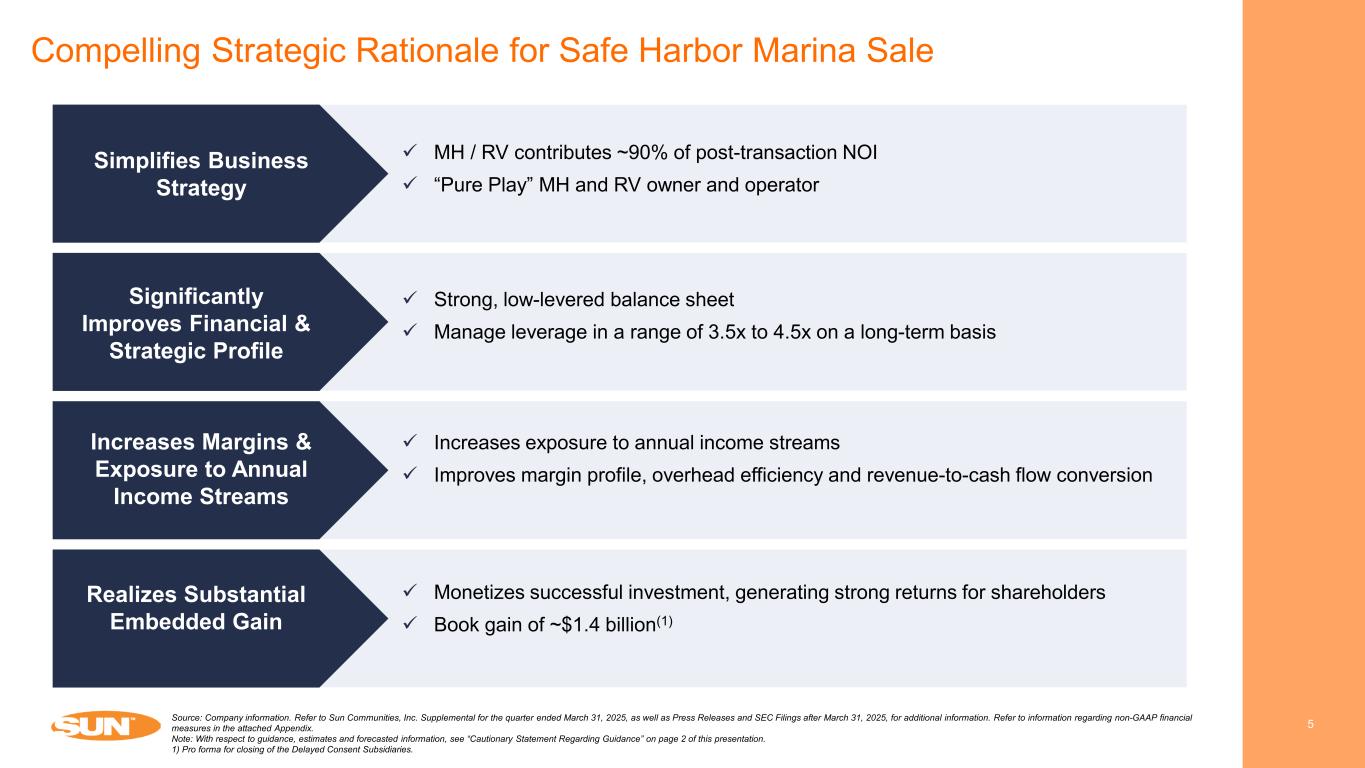 4  ~175,000 sites across ~500 communities Largest Publicly-Traded MH and RV Communities Owner and Operator Source: Company information. Refer to Sun Communities, Inc. Supplemental for the quarter ended March 31, 2025, as well as Press Releases and SEC Filings after March 31, 2025, for additional information. Refer to information regarding non-GAAP financial measures in the attached Appendix. MH 284 high-quality age-restricted and all-age communities with 97K sites operating at 97.3% occupancy 53 holiday parks with 18K annual sites and 4K transient sites RV 165 communities in highly desirable destinations; with 32K annual sites and 24K transient sites (~50% candidates for conversion to annual) SUN RETREATS FOND DU LAC EAST – GLENBEULAH, WIGLEN LAUREL – CONCORD, NC UK RYE HARBOUR – SUSSEX, UK