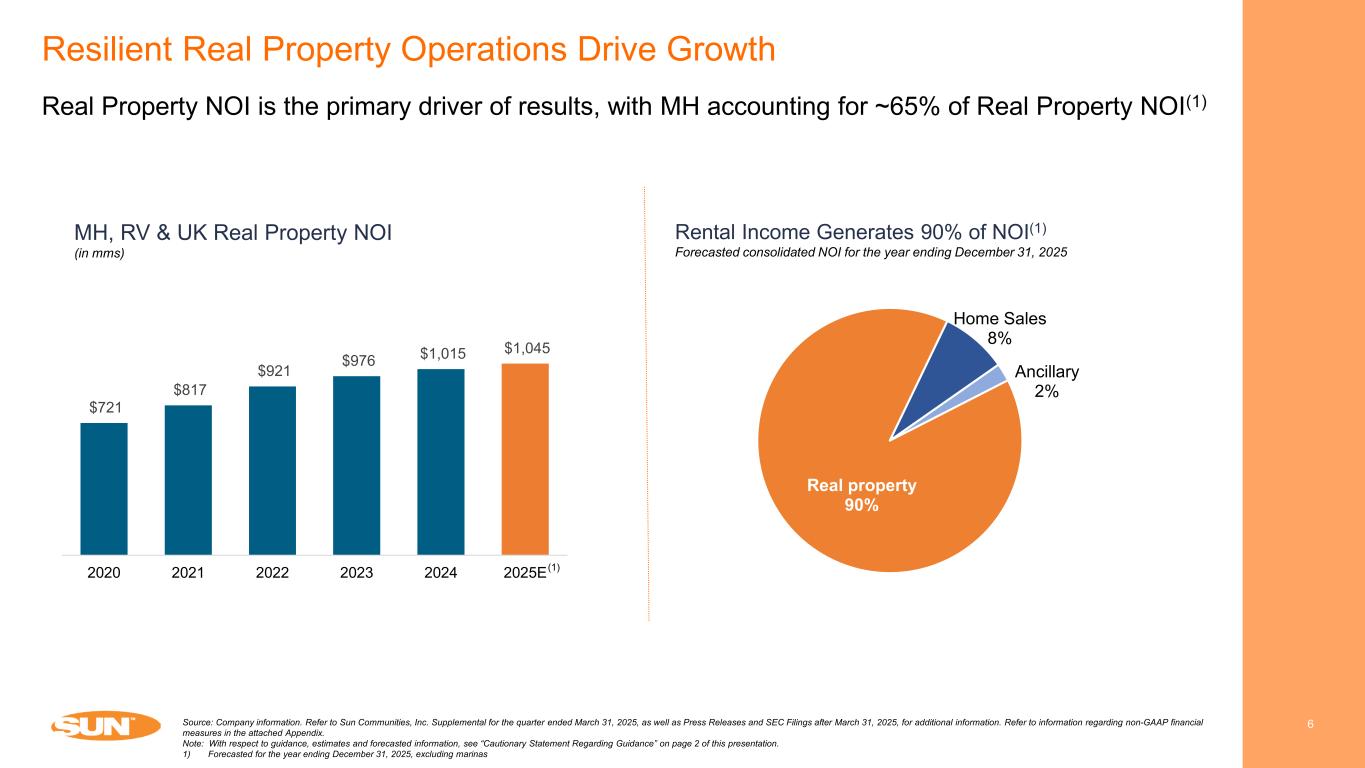 Compelling Strategic Rationale for Safe Harbor Marina Sale 5Source: Company information. Refer to Sun Communities, Inc. Supplemental for the quarter ended March 31, 2025, as well as Press Releases and SEC Filings after March 31, 2025, for additional information. Refer to information regarding non-GAAP financial measures in the attached Appendix. Note: With respect to guidance, estimates and forecasted information, see “Cautionary Statement Regarding Guidance” on page 2 of this presentation. 1) Pro forma for closing of the Delayed Consent Subsidiaries. Simplifies Business Strategy  MH / RV contributes ~90% of post-transaction NOI  “Pure Play” MH and RV owner and operator Significantly Improves Financial & Strategic Profile  Strong, low-levered balance sheet  Manage leverage in a range of 3.5x to 4.5x on a long-term basis Increases Margins & Exposure to Annual Income Streams  Increases exposure to annual income streams  Improves margin profile, overhead efficiency and revenue-to-cash flow conversion Realizes Substantial Embedded Gain  Monetizes successful investment, generating strong returns for shareholders  Book gain of ~$1.4 billion(1)