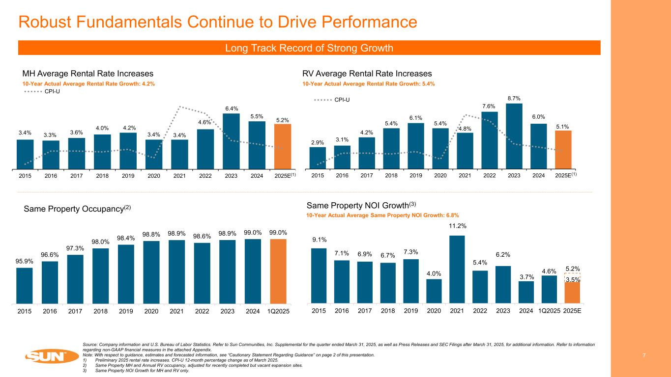 $721 $817 $921 $976 $1,015 $1,045 2020 2021 2022 2023 2024 2025E Resilient Real Property Operations Drive Growth 6 Real Property NOI is the primary driver of results, with MH accounting for ~65% of Real Property NOI(1) MH, RV & UK Real Property NOI (in mms) Rental Income Generates 90% of NOI(1) Forecasted consolidated NOI for the year ending December 31, 2025 Source: Company information. Refer to Sun Communities, Inc. Supplemental for the quarter ended March 31, 2025, as well as Press Releases and SEC Filings after March 31, 2025, for additional information. Refer to information regarding non-GAAP financial measures in the attached Appendix. Note: With respect to guidance, estimates and forecasted information, see “Cautionary Statement Regarding Guidance” on page 2 of this presentation. 1) Forecasted for the year ending December 31, 2025, excluding marinas (1) Real property 90% Home Sales 8% Ancillary 2%