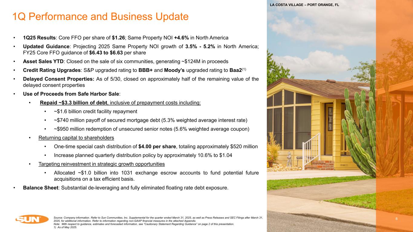 2.9% 3.1% 4.2% 5.4% 6.1% 5.4% 4.8% 7.6% 8.7% 6.0% 5.1% 2015 2016 2017 2018 2019 2020 2021 2022 2023 2024 2025E CPI-U 9.1% 7.1% 6.9% 6.7% 7.3% 4.0% 11.2% 5.4% 6.2% 3.7% 4.6% 3.5% 2015 2016 2017 2018 2019 2020 2021 2022 2023 2024 1Q2025 2025E Robust Fundamentals Continue to Drive Performance 7 Long Track Record of Strong Growth MH Average Rental Rate Increases RV Average Rental Rate Increases Same Property Occupancy(2) Same Property NOI Growth(3) 10-Year Actual Average Same Property NOI Growth: 6.8% 10-Year Actual Average Rental Rate Growth: 4.2% 10-Year Actual Average Rental Rate Growth: 5.4% Source: Company information and U.S. Bureau of Labor Statistics. Refer to Sun Communities, Inc. Supplemental for the quarter ended March 31, 2025, as well as Press Releases and SEC Filings after March 31, 2025, for additional information. Refer to information regarding non-GAAP financial measures in the attached Appendix. Note: With respect to guidance, estimates and forecasted information, see “Cautionary Statement Regarding Guidance” on page 2 of this presentation. 1) Preliminary 2025 rental rate increases. CPI-U 12-month percentage change as of March 2025. 2) Same Property MH and Annual RV occupancy, adjusted for recently completed but vacant expansion sites. 3) Same Property NOI Growth for MH and RV only. 5.2% (1) (1) 95.9% 96.6% 97.3% 98.0% 98.4% 98.8% 98.9% 98.6% 98.9% 99.0% 99.0% 2015 2016 2017 2018 2019 2020 2021 2022 2023 2024 1Q2025 3.4% 3.3% 3.6% 4.0% 4.2% 3.4% 3.4% 4.6% 6.4% 5.5% 5.2% 2015 2016 2017 2018 2019 2020 2021 2022 2023 2024 2025E CPI-U