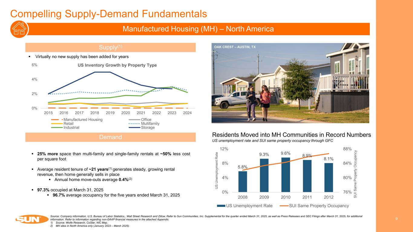 1Q Performance and Business Update 8Source: Company information. Refer to Sun Communities, Inc. Supplemental for the quarter ended March 31, 2025, as well as Press Releases and SEC Filings after March 31, 2025, for additional information. Refer to information regarding non-GAAP financial measures in the attached Appendix. Note: With respect to guidance, estimates and forecasted information, see “Cautionary Statement Regarding Guidance” on page 2 of this presentation. 1) As of May 2025. LA COSTA VILLAGE – PORT ORANGE, FL • 1Q25 Results: Core FFO per share of $1.26; Same Property NOI +4.6% in North America • Updated Guidance: Projecting 2025 Same Property NOI growth of 3.5% - 5.2% in North America; FY25 Core FFO guidance of $6.43 to $6.63 per share • Asset Sales YTD: Closed on the sale of six communities, generating ~$124M in proceeds • Credit Rating Upgrades: S&P upgraded rating to BBB+ and Moody’s upgraded rating to Baa2(1) • Delayed Consent Properties: As of 5/30, closed on approximately half of the remaining value of the delayed consent properties • Use of Proceeds from Safe Harbor Sale: • Repaid ~$3.3 billion of debt, inclusive of prepayment costs including: • ~$1.6 billion credit facility repayment • ~$740 million payoff of secured mortgage debt (5.3% weighted average interest rate) • ~$950 million redemption of unsecured senior notes (5.6% weighted average coupon) • Returning capital to shareholders • One-time special cash distribution of $4.00 per share, totaling approximately $520 million • Increase planned quarterly distribution policy by approximately 10.6% to $1.04 • Targeting reinvestment in strategic growth opportunities • Allocated ~$1.0 billion into 1031 exchange escrow accounts to fund potential future acquisitions on a tax efficient basis. • Balance Sheet: Substantial de-leveraging and fully eliminated floating rate debt exposure.