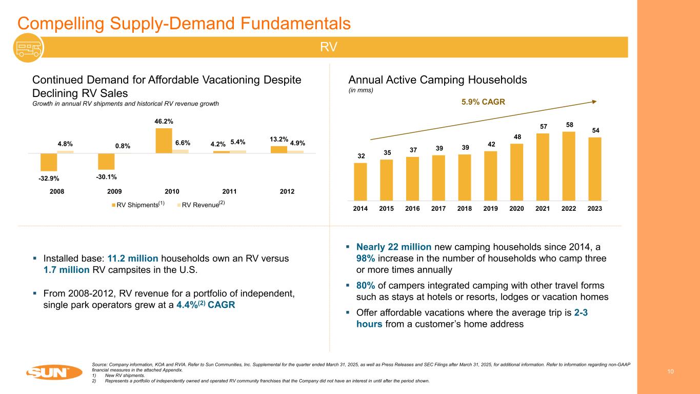Compelling Supply-Demand Fundamentals 9 Manufactured Housing (MH) – North America Source: Company information, U.S. Bureau of Labor Statistics., Wall Street Research and Zillow. Refer to Sun Communities, Inc. Supplemental for the quarter ended March 31, 2025, as well as Press Releases and SEC Filings after March 31, 2025, for additional information. Refer to information regarding non-GAAP financial measures in the attached Appendix. 1) Source: Wolfe Research, CoStar, NIC Map. 2) MH sites in North America only (January 2023 – March 2025).  Virtually no new supply has been added for years  25% more space than multi-family and single-family rentals at ~50% less cost per square foot  Average resident tenure of ~21 years(1) generates steady, growing rental revenue, then home generally sells in place  Annual home move-outs average 0.4%(2)  97.3% occupied at March 31, 2025  96.7% average occupancy for the five years ended March 31, 2025 Demand Supply(1) Residents Moved into MH Communities in Record Numbers US unemployment rate and SUI same property occupancy through GFC OAK CREST – AUSTIN, TX 5.8% 9.3% 9.6% 8.9% 8.1% 76% 80% 84% 88% 0% 4% 8% 12% 2008 2009 2010 2011 2012 SU I S am e Pr op er ty O cc up an cy U S U ne m pl oy m en t R at e US Unemployment Rate SUI Same Property Occupancy 0% 2% 4% 6% 2015 2016 2017 2018 2019 2020 2021 2022 2023 2024 US Inventory Growth by Property Type Manufactured Housing Office Retail Multifamily Industrial Storage