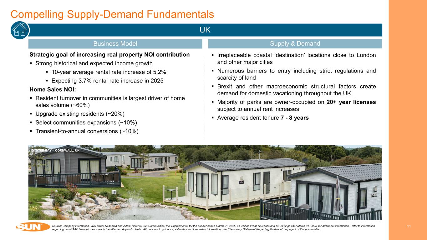 Compelling Supply-Demand Fundamentals 10 RV Continued Demand for Affordable Vacationing Despite Declining RV Sales Growth in annual RV shipments and historical RV revenue growth  Installed base: 11.2 million households own an RV versus 1.7 million RV campsites in the U.S.  From 2008-2012, RV revenue for a portfolio of independent, single park operators grew at a 4.4%(2) CAGR Source: Company information, KOA and RVIA. Refer to Sun Communities, Inc. Supplemental for the quarter ended March 31, 2025, as well as Press Releases and SEC Filings after March 31, 2025, for additional information. Refer to information regarding non-GAAP financial measures in the attached Appendix. 1) New RV shipments. 2) Represents a portfolio of independently owned and operated RV community franchises that the Company did not have an interest in until after the period shown. -32.9% -30.1% 46.2% 4.2% 13.2%4.8% 0.8% 6.6% 5.4% 4.9% 2008 2009 2010 2011 2012 RV Shipments RV Revenue(2)  Nearly 22 million new camping households since 2014, a 98% increase in the number of households who camp three or more times annually  80% of campers integrated camping with other travel forms such as stays at hotels or resorts, lodges or vacation homes  Offer affordable vacations where the average trip is 2-3 hours from a customer’s home address Annual Active Camping Households (in mms) 5.9% CAGR (1) 32 35 37 39 39 42 48 57 58 54 2014 2015 2016 2017 2018 2019 2020 2021 2022 2023
