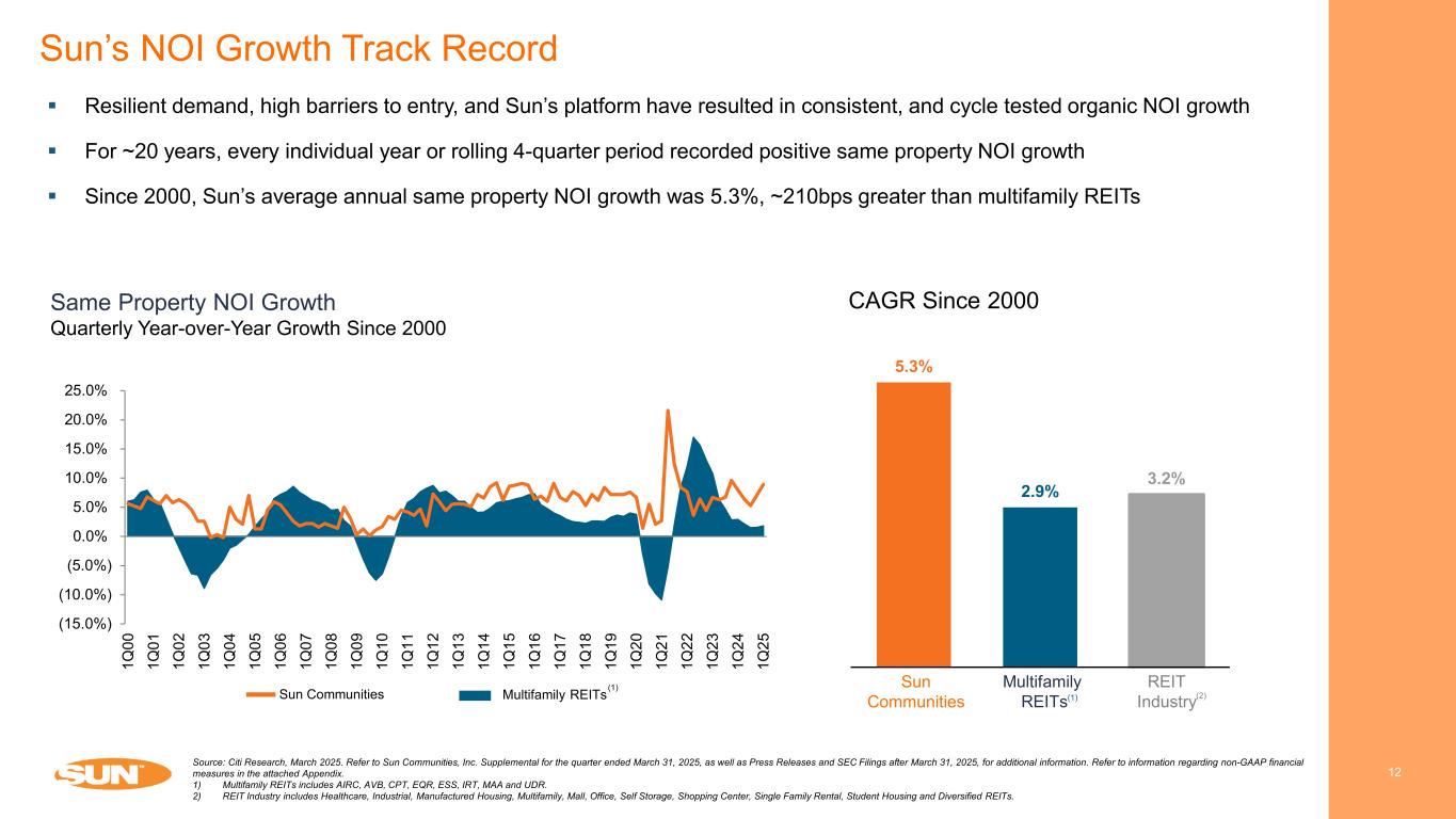 Compelling Supply-Demand Fundamentals 11 UK Source: Company information, Wall Street Research and Zillow. Refer to Sun Communities, Inc. Supplemental for the quarter ended March 31, 2025, as well as Press Releases and SEC Filings after March 31, 2025, for additional information. Refer to information regarding non-GAAP financial measures in the attached Appendix. Note: With respect to guidance, estimates and forecasted information, see “Cautionary Statement Regarding Guidance” on page 2 of this presentation. Strategic goal of increasing real property NOI contribution  Strong historical and expected income growth  10-year average rental rate increase of 5.2%  Expecting 3.7% rental rate increase in 2025 Home Sales NOI:  Resident turnover in communities is largest driver of home sales volume (~60%)  Upgrade existing residents (~20%)  Select communities expansions (~10%)  Transient-to-annual conversions (~10%)  Irreplaceable coastal ‘destination’ locations close to London and other major cities  Numerous barriers to entry including strict regulations and scarcity of land  Brexit and other macroeconomic structural factors create demand for domestic vacationing throughout the UK  Majority of parks are owner-occupied on 20+ year licenses subject to annual rent increases  Average resident tenure 7 - 8 years Supply & DemandBusiness Model (1) OYSTER BAY – CORNWALL, UK
