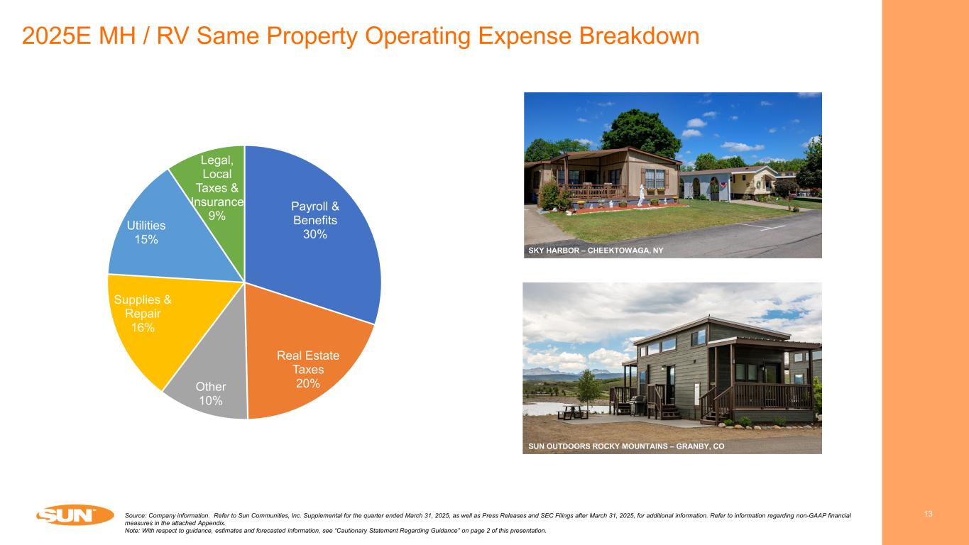 Sun’s NOI Growth Track Record 12 Multifamily REITsSun Communities  Resilient demand, high barriers to entry, and Sun’s platform have resulted in consistent, and cycle tested organic NOI growth  For ~20 years, every individual year or rolling 4-quarter period recorded positive same property NOI growth  Since 2000, Sun’s average annual same property NOI growth was 5.3%, ~210bps greater than multifamily REITs Same Property NOI Growth Quarterly Year-over-Year Growth Since 2000 Source: Citi Research, March 2025. Refer to Sun Communities, Inc. Supplemental for the quarter ended March 31, 2025, as well as Press Releases and SEC Filings after March 31, 2025, for additional information. Refer to information regarding non-GAAP financial measures in the attached Appendix. 1) Multifamily REITs includes AIRC, AVB, CPT, EQR, ESS, IRT, MAA and UDR. 2) REIT Industry includes Healthcare, Industrial, Manufactured Housing, Multifamily, Mall, Office, Self Storage, Shopping Center, Single Family Rental, Student Housing and Diversified REITs. (1) CAGR Since 2000 Sun Communities Multifamily REITs REIT Industry(1) (2) 5.3% 2.9% 3.2% (15.0%) (10.0%) (5.0%) 0.0% 5.0% 10.0% 15.0% 20.0% 25.0% 1Q 00 1Q 01 1Q 02 1Q 03 1Q 04 1Q 05 1Q 06 1Q 07 1Q 08 1Q 09 1Q 10 1Q 11 1Q 12 1Q 13 1Q 14 1Q 15 1Q 16 1Q 17 1Q 18 1Q 19 1Q 20 1Q 21 1Q 22 1Q 23 1Q 24 1Q 25