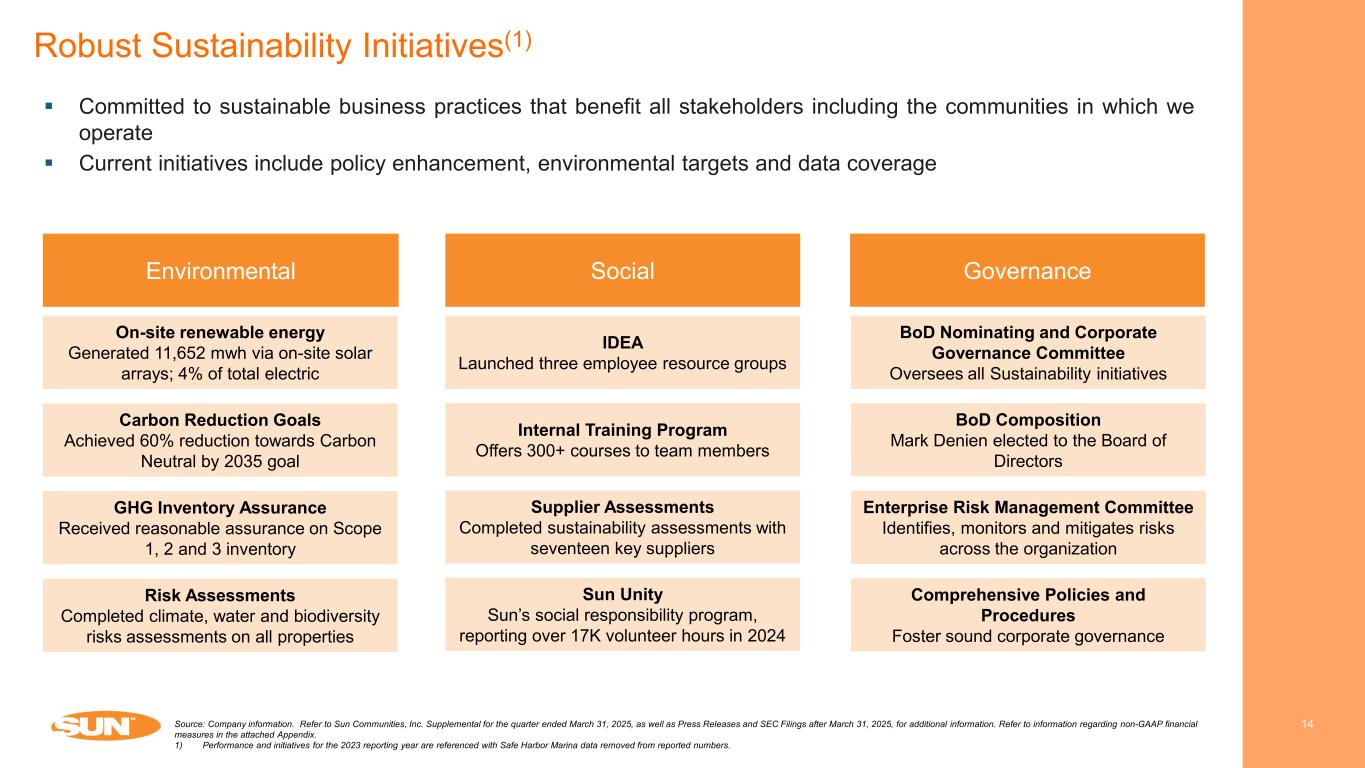 2025E MH / RV Same Property Operating Expense Breakdown 13 SKY HARBOR – CHEEKTOWAGA, NY Source: Company information. Refer to Sun Communities, Inc. Supplemental for the quarter ended March 31, 2025, as well as Press Releases and SEC Filings after March 31, 2025, for additional information. Refer to information regarding non-GAAP financial measures in the attached Appendix. Note: With respect to guidance, estimates and forecasted information, see “Cautionary Statement Regarding Guidance” on page 2 of this presentation. SUN OUTDOORS ROCKY MOUNTAINS – GRANBY, CO Payroll & Benefits 30% Real Estate Taxes 20%Other 10% Supplies & Repair 16% Utilities 15% Legal, Local Taxes & Insurance 9%
