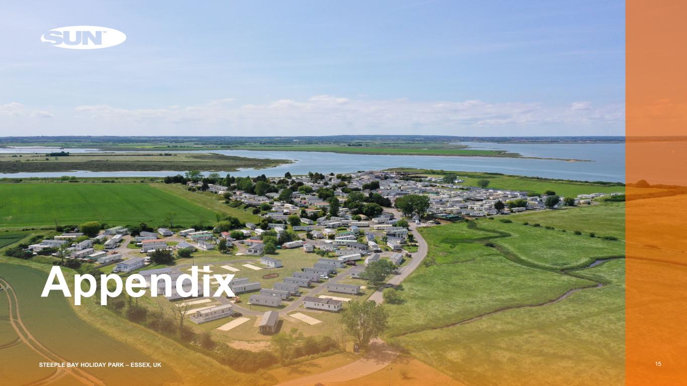 Robust Sustainability Initiatives(1) 14 Environmental  Committed to sustainable business practices that benefit all stakeholders including the communities in which we operate  Current initiatives include policy enhancement, environmental targets and data coverage Social Internal Training Program Offers 300+ courses to team members IDEA Launched three employee resource groups Governance BoD Nominating and Corporate Governance Committee Oversees all Sustainability initiatives Enterprise Risk Management Committee Identifies, monitors and mitigates risks across the organization Supplier Assessments Completed sustainability assessments with seventeen key suppliers BoD Composition Mark Denien elected to the Board of Directors Sun Unity Sun’s social responsibility program, reporting over 17K volunteer hours in 2024 Comprehensive Policies and Procedures Foster sound corporate governance Source: Company information. Refer to Sun Communities, Inc. Supplemental for the quarter ended March 31, 2025, as well as Press Releases and SEC Filings after March 31, 2025, for additional information. Refer to information regarding non-GAAP financial measures in the attached Appendix. 1) Performance and initiatives for the 2023 reporting year are referenced with Safe Harbor Marina data removed from reported numbers. On-site renewable energy Generated 11,652 mwh via on-site solar arrays; 4% of total electric Carbon Reduction Goals Achieved 60% reduction towards Carbon Neutral by 2035 goal GHG Inventory Assurance Received reasonable assurance on Scope 1, 2 and 3 inventory Risk Assessments Completed climate, water and biodiversity risks assessments on all properties