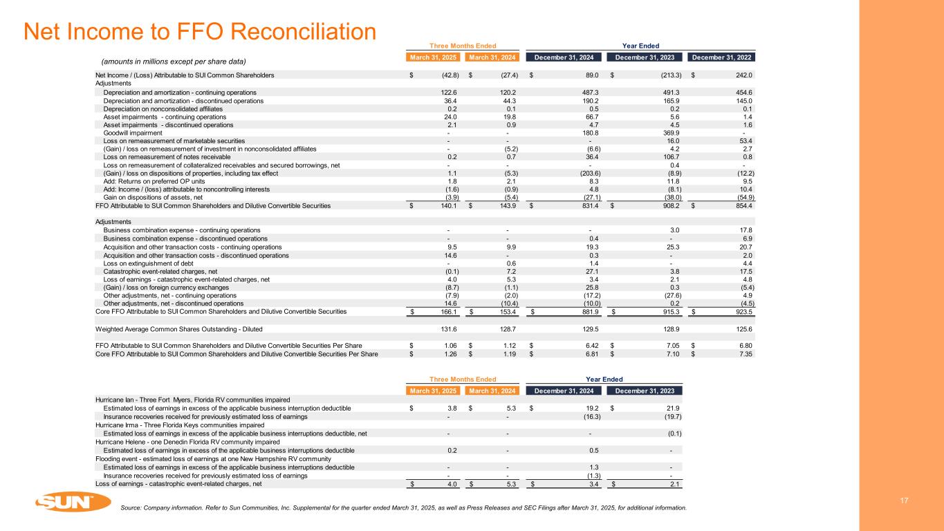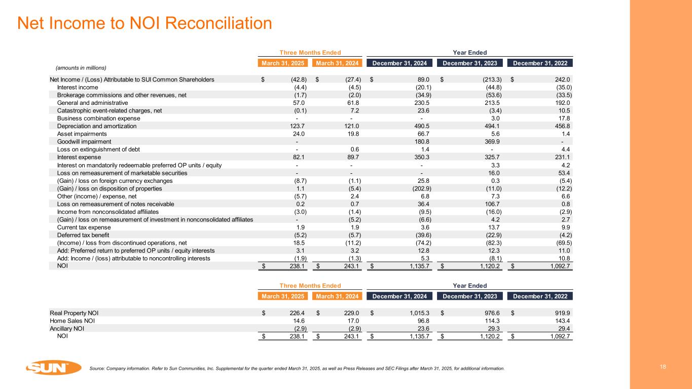 Net Income to FFO Reconciliation 17 Source: Company information. Refer to Sun Communities, Inc. Supplemental for the quarter ended March 31, 2025, as well as Press Releases and SEC Filings after March 31, 2025, for additional information. March 31, 2025 March 31, 2024 December 31, 2024 December 31, 2023 December 31, 2022 Net Income / (Loss) Attributable to SUI Common Shareholders (42.8)$ (27.4)$ 89.0$ (213.3)$ 242.0$ Adjustments Depreciation and amortization - continuing operations 122.6 120.2 487.3 491.3 454.6 Depreciation and amortization - discontinued operations 36.4 44.3 190.2 165.9 145.0 Depreciation on nonconsolidated affiliates 0.2 0.1 0.5 0.2 0.1 Asset impairments - continuing operations 24.0 19.8 66.7 5.6 1.4 Asset impairments - discontinued operations 2.1 0.9 4.7 4.5 1.6 Goodwill impairment - - 180.8 369.9 - Loss on remeasurement of marketable securities - - - 16.0 53.4 (Gain) / loss on remeasurement of investment in nonconsolidated affiliates - (5.2) (6.6) 4.2 2.7 Loss on remeasurement of notes receivable 0.2 0.7 36.4 106.7 0.8 Loss on remeasurement of collateralized receivables and secured borrowings, net - - - 0.4 - (Gain) / loss on dispositions of properties, including tax effect 1.1 (5.3) (203.6) (8.9) (12.2) Add: Returns on preferred OP units 1.8 2.1 8.3 11.8 9.5 Add: Income / (loss) attributable to noncontrolling interests (1.6) (0.9) 4.8 (8.1) 10.4 Gain on dispositions of assets, net (3.9) (5.4) (27.1) (38.0) (54.9) FFO Attributable to SUI Common Shareholders and Dilutive Convertible Securities 140.1$ 143.9$ 831.4$ 908.2$ 854.4$ Adjustments Business combination expense - continuing operations - - - 3.0 17.8 Business combination expense - discontinued operations - - 0.4 - 6.9 Acquisition and other transaction costs - continuing operations 9.5 9.9 19.3 25.3 20.7 Acquisition and other transaction costs - discontinued operations 14.6 - 0.3 - 2.0 Loss on extinguishment of debt - 0.6 1.4 - 4.4 Catastrophic event-related charges, net (0.1) 7.2 27.1 3.8 17.5 Loss of earnings - catastrophic event-related charges, net 4.0 5.3 3.4 2.1 4.8 (Gain) / loss on foreign currency exchanges (8.7) (1.1) 25.8 0.3 (5.4) Other adjustments, net - continuing operations (7.9) (2.0) (17.2) (27.6) 4.9 Other adjustments, net - discontinued operations 14.6 (10.4) (10.0) 0.2 (4.5) Core FFO Attributable to SUI Common Shareholders and Dilutive Convertible Securities 166.1$ 153.4$ 881.9$ 915.3$ 923.5$ Weighted Average Common Shares Outstanding - Diluted 131.6 128.7 129.5 128.9 125.6 FFO Attributable to SUI Common Shareholders and Dilutive Convertible Securities Per Share 1.06$ 1.12$ 6.42$ 7.05$ 6.80$ Core FFO Attributable to SUI Common Shareholders and Dilutive Convertible Securities Per Share 1.26$ 1.19$ 6.81$ 7.10$ 7.35$ March 31, 2025 March 31, 2024 December 31, 2024 December 31, 2023 Hurricane Ian - Three Fort Myers, Florida RV communities impaired Estimated loss of earnings in excess of the applicable business interruption deductible 3.8$ 5.3$ 19.2$ 21.9$ Insurance recoveries received for previously estimated loss of earnings - - (16.3) (19.7) Hurricane Irma - Three Florida Keys communities impaired Estimated loss of earnings in excess of the applicable business interruptions deductible, net - - - (0.1) Hurricane Helene - one Denedin Florida RV community impaired Estimated loss of earnings in excess of the applicable business interruptions deductible 0.2 - 0.5 - Flooding event - estimated loss of earnings at one New Hampshire RV community Estimated loss of earnings in excess of the applicable business interruptions deductible - - 1.3 - Insurance recoveries received for previously estimated loss of earnings - - (1.3) - Loss of earnings - catastrophic event-related charges, net 4.0$ 5.3$ 3.4$ 2.1$ Year EndedThree Months Ended Three Months Ended Year Ended (amounts in millions except per share data)