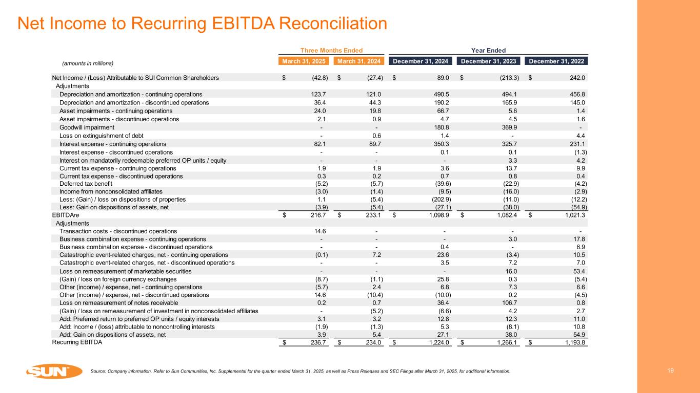 Net Income to NOI Reconciliation 18Source: Company information. Refer to Sun Communities, Inc. Supplemental for the quarter ended March 31, 2025, as well as Press Releases and SEC Filings after March 31, 2025, for additional information. March 31, 2025 March 31, 2024 December 31, 2024 December 31, 2023 December 31, 2022 Net Income / (Loss) Attributable to SUI Common Shareholders (42.8)$ (27.4)$ 89.0$ (213.3)$ 242.0$ Interest income (4.4) (4.5) (20.1) (44.8) (35.0) Brokerage commissions and other revenues, net (1.7) (2.0) (34.9) (53.6) (33.5) General and administrative 57.0 61.8 230.5 213.5 192.0 Catastrophic event-related charges, net (0.1) 7.2 23.6 (3.4) 10.5 Business combination expense - - - 3.0 17.8 Depreciation and amortization 123.7 121.0 490.5 494.1 456.8 Asset impairments 24.0 19.8 66.7 5.6 1.4 Goodwill impairment - 180.8 369.9 - Loss on extinguishment of debt - 0.6 1.4 - 4.4 Interest expense 82.1 89.7 350.3 325.7 231.1 Interest on mandatorily redeemable preferred OP units / equity - - - 3.3 4.2 Loss on remeasurement of marketable securities - - - 16.0 53.4 (Gain) / loss on foreign currency exchanges (8.7) (1.1) 25.8 0.3 (5.4) (Gain) / loss on disposition of properties 1.1 (5.4) (202.9) (11.0) (12.2) Other (income) / expense, net (5.7) 2.4 6.8 7.3 6.6 Loss on remeasurement of notes receivable 0.2 0.7 36.4 106.7 0.8 Income from nonconsolidated affiliates (3.0) (1.4) (9.5) (16.0) (2.9) (Gain) / loss on remeasurement of investment in nonconsolidated affiliates - (5.2) (6.6) 4.2 2.7 Current tax expense 1.9 1.9 3.6 13.7 9.9 Deferred tax benefit (5.2) (5.7) (39.6) (22.9) (4.2) (Income) / loss from discontinued operations, net 18.5 (11.2) (74.2) (82.3) (69.5) Add: Preferred return to preferred OP units / equity interests 3.1 3.2 12.8 12.3 11.0 Add: Income / (loss) attributable to noncontrolling interests (1.9) (1.3) 5.3 (8.1) 10.8 NOI 238.1$ 243.1$ 1,135.7$ 1,120.2$ 1,092.7$ March 31, 2025 March 31, 2024 December 31, 2024 December 31, 2023 December 31, 2022 Real Property NOI 226.4$ 229.0$ 1,015.3$ 976.6$ 919.9$ Home Sales NOI 14.6 17.0 96.8 114.3 143.4 Ancillary NOI (2.9) (2.9) 23.6 29.3 29.4 NOI 238.1$ 243.1$ 1,135.7$ 1,120.2$ 1,092.7$ Year Ended Year Ended Three Months Ended Three Months Ended (amounts in millions)
