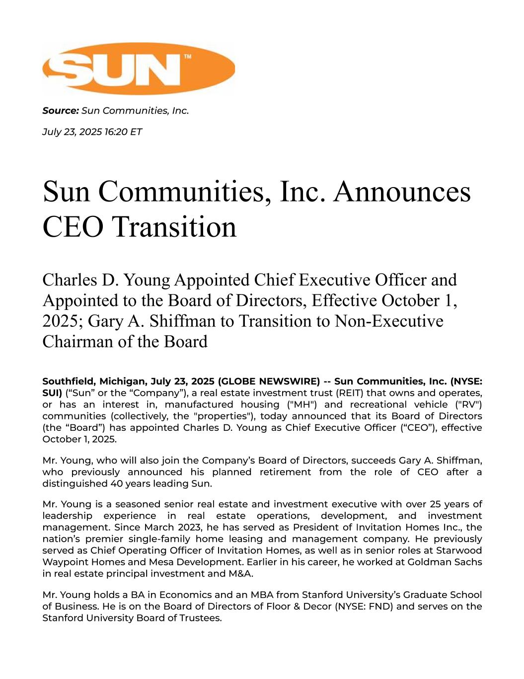 Source: Sun Communities, Inc. July 23, 2025 16:20 ET Sun Communities, Inc. Announces CEO Transition Charles D. Young Appointed Chief Executive Officer and Appointed to the Board of Directors, Effective October 1, 2025; Gary A. Shiffman to Transition to Non-Executive Chairman of the Board Southfield, Michigan, July 23, 2025 (GLOBE NEWSWIRE) -- Sun Communities, Inc. (NYSE: SUI) (“Sun” or the “Company”), a real estate investment trust (REIT) that owns and operates, or has an interest in, manufactured housing ("MH") and recreational vehicle ("RV") communities (collectively, the "properties"), today announced that its Board of Directors (the “Board”) has appointed Charles D. Young as Chief Executive Officer (“CEO”), effective October 1, 2025. Mr. Young, who will also join the Company’s Board of Directors, succeeds Gary A. Shiffman, who previously announced his planned retirement from the role of CEO after a distinguished 40 years leading Sun. Mr. Young is a seasoned senior real estate and investment executive with over 25 years of leadership experience in real estate operations, development, and investment management. Since March 2023, he has served as President of Invitation Homes Inc., the nation’s premier single-family home leasing and management company. He previously served as Chief Operating Officer of Invitation Homes, as well as in senior roles at Starwood Waypoint Homes and Mesa Development. Earlier in his career, he worked at Goldman Sachs in real estate principal investment and M&A. Mr. Young holds a BA in Economics and an MBA from Stanford University’s Graduate School of Business. He is on the Board of Directors of Floor & Decor (NYSE: FND) and serves on the Stanford University Board of Trustees.