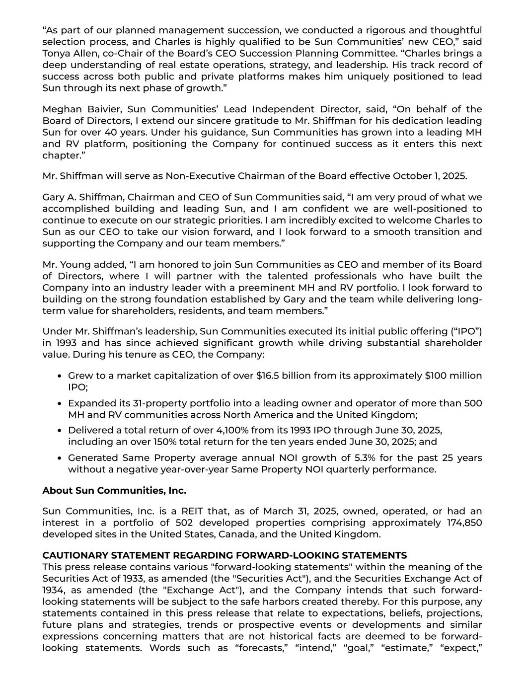 “As part of our planned management succession, we conducted a rigorous and thoughtful selection process, and Charles is highly qualified to be Sun Communities’ new CEO,” said Tonya Allen, co-Chair of the Board’s CEO Succession Planning Committee. “Charles brings a deep understanding of real estate operations, strategy, and leadership. His track record of success across both public and private platforms makes him uniquely positioned to lead Sun through its next phase of growth.” Meghan Baivier, Sun Communities’ Lead Independent Director, said, “On behalf of the Board of Directors, I extend our sincere gratitude to Mr. Shiffman for his dedication leading Sun for over 40 years. Under his guidance, Sun Communities has grown into a leading MH and RV platform, positioning the Company for continued success as it enters this next chapter.” Mr. Shiffman will serve as Non-Executive Chairman of the Board effective October 1, 2025. Gary A. Shiffman, Chairman and CEO of Sun Communities said, “I am very proud of what we accomplished building and leading Sun, and I am confident we are well-positioned to continue to execute on our strategic priorities. I am incredibly excited to welcome Charles to Sun as our CEO to take our vision forward, and I look forward to a smooth transition and supporting the Company and our team members.”  Mr. Young added, “I am honored to join Sun Communities as CEO and member of its Board of Directors, where I will partner with the talented professionals who have built the Company into an industry leader with a preeminent MH and RV portfolio. I look forward to building on the strong foundation established by Gary and the team while delivering long- term value for shareholders, residents, and team members.” Under Mr. Shiffman’s leadership, Sun Communities executed its initial public offering (“IPO”) in 1993 and has since achieved significant growth while driving substantial shareholder value. During his tenure as CEO, the Company: Grew to a market capitalization of over $16.5 billion from its approximately $100 million IPO; Expanded its 31-property portfolio into a leading owner and operator of more than 500 MH and RV communities across North America and the United Kingdom; Delivered a total return of over 4,100% from its 1993 IPO through June 30, 2025, including an over 150% total return for the ten years ended June 30, 2025; and Generated Same Property average annual NOI growth of 5.3% for the past 25 years without a negative year-over-year Same Property NOI quarterly performance. About Sun Communities, Inc. Sun Communities, Inc. is a REIT that, as of March 31, 2025, owned, operated, or had an interest in a portfolio of 502 developed properties comprising approximately 174,850 developed sites in the United States, Canada, and the United Kingdom. CAUTIONARY STATEMENT REGARDING FORWARD-LOOKING STATEMENTS This press release contains various "forward-looking statements" within the meaning of the Securities Act of 1933, as amended (the "Securities Act"), and the Securities Exchange Act of 1934, as amended (the "Exchange Act"), and the Company intends that such forward- looking statements will be subject to the safe harbors created thereby. For this purpose, any statements contained in this press release that relate to expectations, beliefs, projections, future plans and strategies, trends or prospective events or developments and similar expressions concerning matters that are not historical facts are deemed to be forward- looking statements. Words such as “forecasts,” “intend,” “goal,” “estimate,” “expect,”