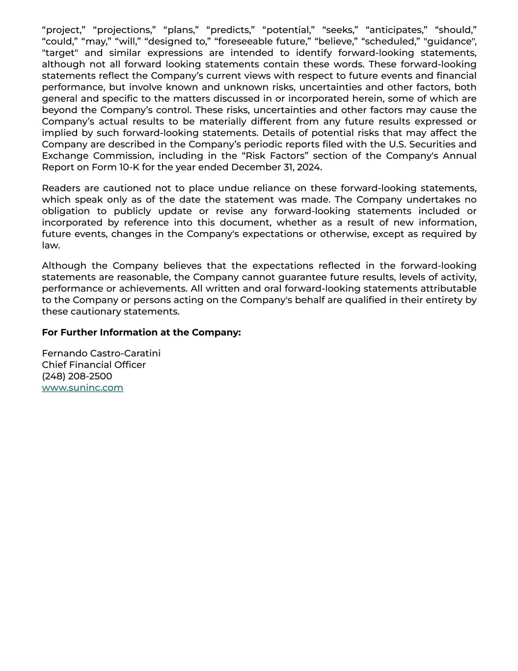 “project,” “projections,” “plans,” “predicts,” “potential,” “seeks,” “anticipates,” “should,” “could,” “may,” “will,” “designed to,” “foreseeable future,” “believe,” “scheduled,” "guidance", "target" and similar expressions are intended to identify forward-looking statements, although not all forward looking statements contain these words. These forward-looking statements reflect the Company’s current views with respect to future events and financial performance, but involve known and unknown risks, uncertainties and other factors, both general and specific to the matters discussed in or incorporated herein, some of which are beyond the Company’s control. These risks, uncertainties and other factors may cause the Company’s actual results to be materially different from any future results expressed or implied by such forward-looking statements. Details of potential risks that may affect the Company are described in the Company’s periodic reports filed with the U.S. Securities and Exchange Commission, including in the “Risk Factors” section of the Company's Annual Report on Form 10-K for the year ended December 31, 2024. Readers are cautioned not to place undue reliance on these forward-looking statements, which speak only as of the date the statement was made. The Company undertakes no obligation to publicly update or revise any forward-looking statements included or incorporated by reference into this document, whether as a result of new information, future events, changes in the Company's expectations or otherwise, except as required by law. Although the Company believes that the expectations reflected in the forward-looking statements are reasonable, the Company cannot guarantee future results, levels of activity, performance or achievements. All written and oral forward-looking statements attributable to the Company or persons acting on the Company's behalf are qualified in their entirety by these cautionary statements. For Further Information at the Company: Fernando Castro-Caratini Chief Financial Officer (248) 208-2500 www.suninc.com