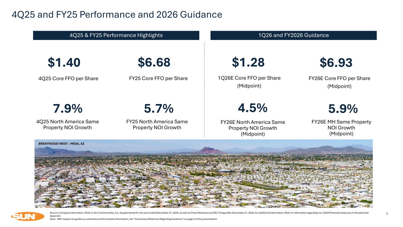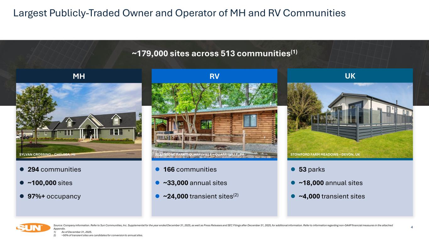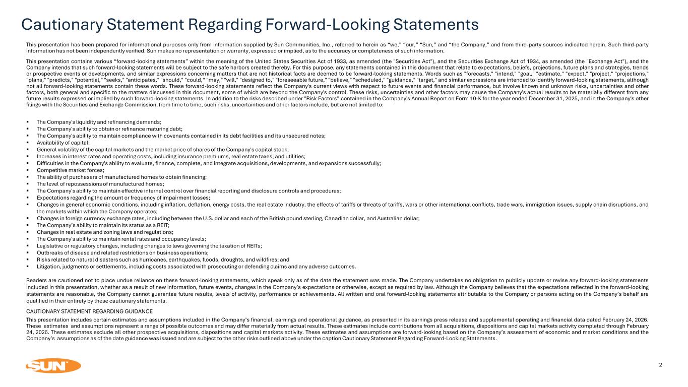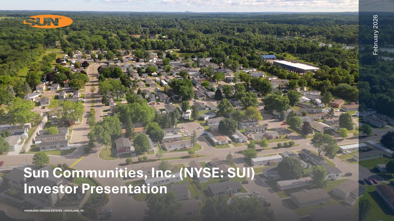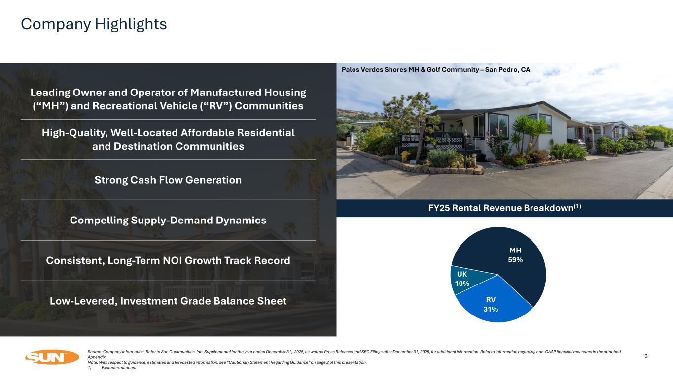 Cautionary Statement Regarding Forward-Looking Statements 2 This presentation has been prepared for informational purposes only from information supplied by Sun Communities, Inc., referred to herein as “we,” “our,” “Sun,” and “the Company,” and from third-party sources indicated herein. Such third-party information has not been independently verified. Sun makes no representation or warranty, expressed or implied, as to the accuracy or completeness of such information. This presentation contains various “forward-looking statements” within the meaning of the United States Securities Act of 1933, as amended (the "Securities Act"), and the Securities Exchange Act of 1934, as amended (the "Exchange Act"), and the Company intends that such forward-looking statements will be subject to the safe harbors created thereby. For this purpose, any statements contained in this document that relate to expectations, beliefs, projections, future plans and strategies, trends or prospective events or developments, and similar expressions concerning matters that are not historical facts are deemed to be forward-looking statements. Words such as "forecasts," "intend," "goal," "estimate," "expect," "project," "projections," "plans," "predicts," "potential," "seeks," "anticipates," "should," "could,“ "may," "will," "designed to," "foreseeable future," "believe," "scheduled," "guidance," "target," and similar expressions are intended to identify forward-looking statements, although not all forward-looking statements contain these words. These forward-looking statements reflect the Company's current views with respect to future events and financial performance, but involve known and unknown risks, uncertainties and other factors, both general and specific to the matters discussed in this document, some of which are beyond the Company's control. These risks, uncertainties and other factors may cause the Company's actual results to be materially different from any future results expressed or implied by such forward-looking statements. In addition to the risks described under "Risk Factors” contained in the Company's Annual Report on Form 10-K for the year ended December 31, 2025, and in the Company's other filings with the Securities and Exchange Commission, from time to time, such risks, uncertainties and other factors include, but are not limited to:  The Company's liquidity and refinancing demands;  The Company's ability to obtain or refinance maturing debt;  The Company's ability to maintain compliance with covenants contained in its debt facilities and its unsecured notes;  Availability of capital;  General volatility of the capital markets and the market price of shares of the Company's capital stock;  Increases in interest rates and operating costs, including insurance premiums, real estate taxes, and utilities;  Difficulties in the Company's ability to evaluate, finance, complete, and integrate acquisitions, developments, and expansions successfully;  Competitive market forces;  The ability of purchasers of manufactured homes to obtain financing;  The level of repossessions of manufactured homes;  The Company's ability to maintain effective internal control over financial reporting and disclosure controls and procedures;  Expectations regarding the amount or frequency of impairment losses;  Changes in general economic conditions, including inflation, deflation, energy costs, the real estate industry, the effects of tariffs or threats of tariffs, wars or other international conflicts, trade wars, immigration issues, supply chain disruptions, and the markets within which the Company operates;  Changes in foreign currency exchange rates, including between the U.S. dollar and each of the British pound sterling, Canadian dollar, and Australian dollar;  The Company’s ability to maintain its status as a REIT;  Changes in real estate and zoning laws and regulations;  The Company's ability to maintain rental rates and occupancy levels;  Legislative or regulatory changes, including changes to laws governing the taxation of REITs;  Outbreaks of disease and related restrictions on business operations;  Risks related to natural disasters such as hurricanes, earthquakes, floods, droughts, and wildfires; and  Litigation, judgments or settlements, including costs associated with prosecuting or defending claims and any adverse outcomes. Readers are cautioned not to place undue reliance on these forward-looking statements, which speak only as of the date the statement was made. The Company undertakes no obligation to publicly update or revise any forward-looking statements included in this presentation, whether as a result of new information, future events, changes in the Company’s expectations or otherwise, except as required by law. Although the Company believes that the expectations reflected in the forward-looking statements are reasonable, the Company cannot guarantee future results, levels of activity, performance or achievements. All written and oral forward-looking statements attributable to the Company or persons acting on the Company’s behalf are qualified in their entirety by these cautionary statements. CAUTIONARY STATEMENT REGARDING GUIDANCE This presentation includes certain estimates and assumptions included in the Company’s financial, earnings and operational guidance, as presented in its earnings press release and supplemental operating and financial data dated February 24, 2026. These estimates and assumptions represent a range of possible outcomes and may differ materially from actual results. These estimates include contributions from all acquisitions, dispositions and capital markets activity completed through February 24, 2026. These estimates exclude all other prospective acquisitions, dispositions and capital markets activity. These estimates and assumptions are forward-looking based on the Company’s asses