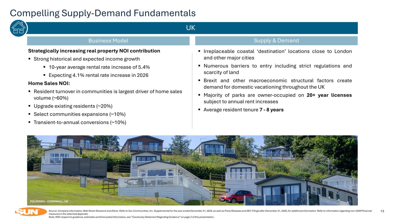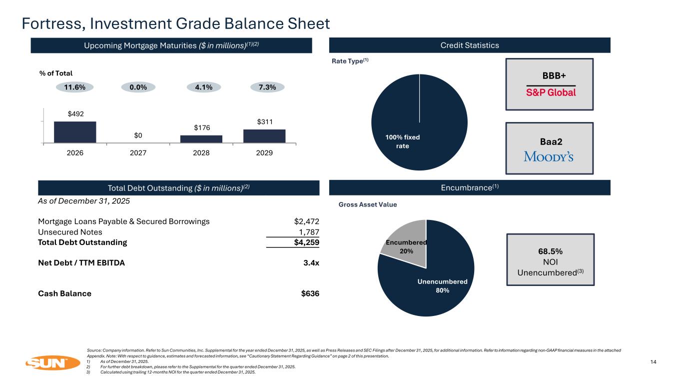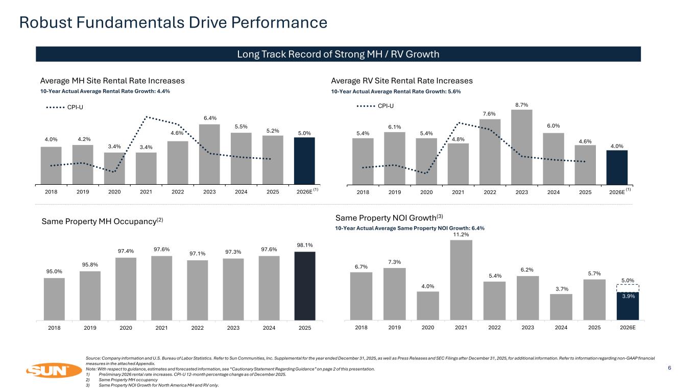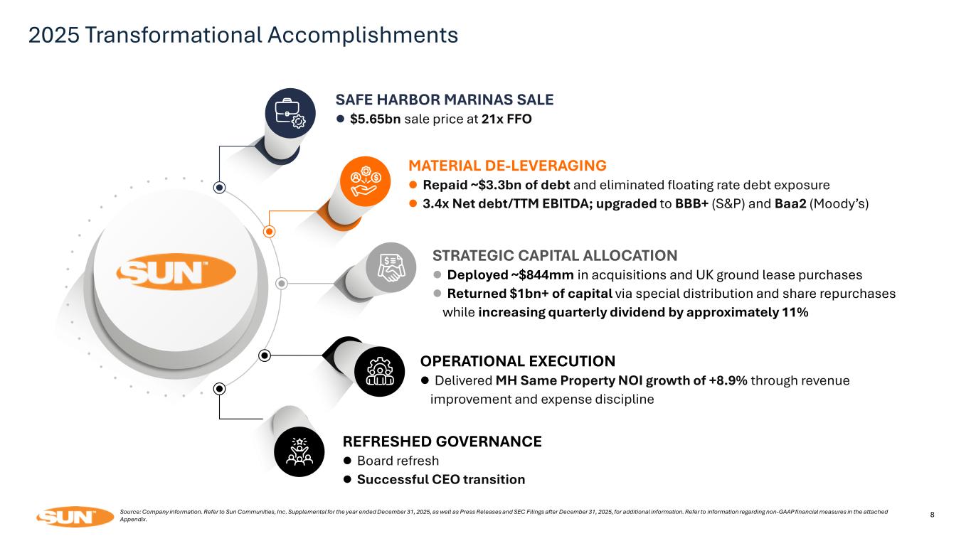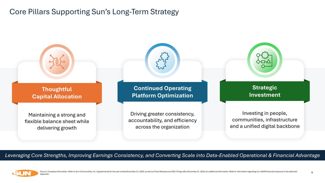 Cautionary Statement Regarding Forward-Looking Statements 2 This presentation has been prepared for informational purposes only from information supplied by Sun Communities, Inc., referred to herein as “we,” “our,” “Sun,” and “the Company,” and from third-party sources indicated herein. Such third-party information has not been independently verified. Sun makes no representation or warranty, expressed or implied, as to the accuracy or completeness of such information. This presentation contains various “forward-looking statements” within the meaning of the United States Securities Act of 1933, as amended (the "Securities Act"), and the Securities Exchange Act of 1934, as amended (the "Exchange Act"), and the Company intends that such forward-looking statements will be subject to the safe harbors created thereby. For this purpose, any statements contained in this document that relate to expectations, beliefs, projections, future plans and strategies, trends or prospective events or developments, and similar expressions concerning matters that are not historical facts are deemed to be forward-looking statements. Words such as "forecasts," "intend," "goal," "estimate," "expect," "project," "projections," "plans," "predicts," "potential," "seeks," "anticipates," "should," "could,“ "may," "will," "designed to," "foreseeable future," "believe," "scheduled," "guidance," "target," and similar expressions are intended to identify forward-looking statements, although not all forward-looking statements contain these words. These forward-looking statements reflect the Company's current views with respect to future events and financial performance, but involve known and unknown risks, uncertainties and other factors, both general and specific to the matters discussed in this document, some of which are beyond the Company's control. These risks, uncertainties and other factors may cause the Company's actual results to be materially different from any future results expressed or implied by such forward-looking statements. In addition to the risks described under "Risk Factors” contained in the Company's Annual Report on Form 10-K for the year ended December 31, 2025, and in the Company's other filings with the Securities and Exchange Commission, from time to time, such risks, uncertainties and other factors include, but are not limited to:  The Company's liquidity and refinancing demands;  The Company's ability to obtain or refinance maturing debt;  The Company's ability to maintain compliance with covenants contained in its debt facilities and its unsecured notes;  Availability of capital;  General volatility of the capital markets and the market price of shares of the Company's capital stock;  Increases in interest rates and operating costs, including insurance premiums, real estate taxes, and utilities;  Difficulties in the Company's ability to evaluate, finance, complete, and integrate acquisitions, developments, and expansions successfully;  Competitive market forces;  The ability of purchasers of manufactured homes to obtain financing;  The level of repossessions of manufactured homes;  The Company's ability to maintain effective internal control over financial reporting and disclosure controls and procedures;  Expectations regarding the amount or frequency of impairment losses;  Changes in general economic conditions, including inflation, deflation, energy costs, the real estate industry, the effects of tariffs or threats of tariffs, wars or other international conflicts, trade wars, immigration issues, supply chain disruptions, and the markets within which the Company operates;  Changes in foreign currency exchange rates, including between the U.S. dollar and each of the British pound sterling, Canadian dollar, and Australian dollar;  The Company’s ability to maintain its status as a REIT;  Changes in real estate and zoning laws and regulations;  The Company's ability to maintain rental rates and occupancy levels;  Legislative or regulatory changes, including changes to laws governing the taxation of REITs;  Outbreaks of disease and related restrictions on business operations;  Risks related to natural disasters such as hurricanes, earthquakes, floods, droughts, and wildfires; and  Litigation, judgments or settlements, including costs associated with prosecuting or defending claims and any adverse outcomes. Readers are cautioned not to place undue reliance on these forward-looking statements, which speak only as of the date the statement was made. The Company undertakes no obligation to publicly update or revise any forward-looking statements included in this presentation, whether as a result of new information, future events, changes in the Company’s expectations or otherwise, except as required by law. Although the Company believes that the expectations reflected in the forward-looking statements are reasonable, the Company cannot guarantee future results, levels of activity, performance or achievements. All written and oral forward-looking statements attributable to the Company or persons acting on the Company’s behalf are qualified in their entirety by these cautionary statements. CAUTIONARY STATEMENT REGARDING GUIDANCE This presentation includes certain estimates and assumptions included in the Company’s financial, earnings and operational guidance, as presented in its earnings press release and supplemental operating and financial data dated February 24, 2026. These estimates and assumptions represent a range of possible outcomes and may differ materially from actual results. These estimates include contributions from all acquisitions, dispositions and capital markets activity completed through February 24, 2026. These estimates exclude all other prospective acquisitions, dispositions and capital markets activity. These estimates and assumptions are forward-looking based on the Company’s asses
