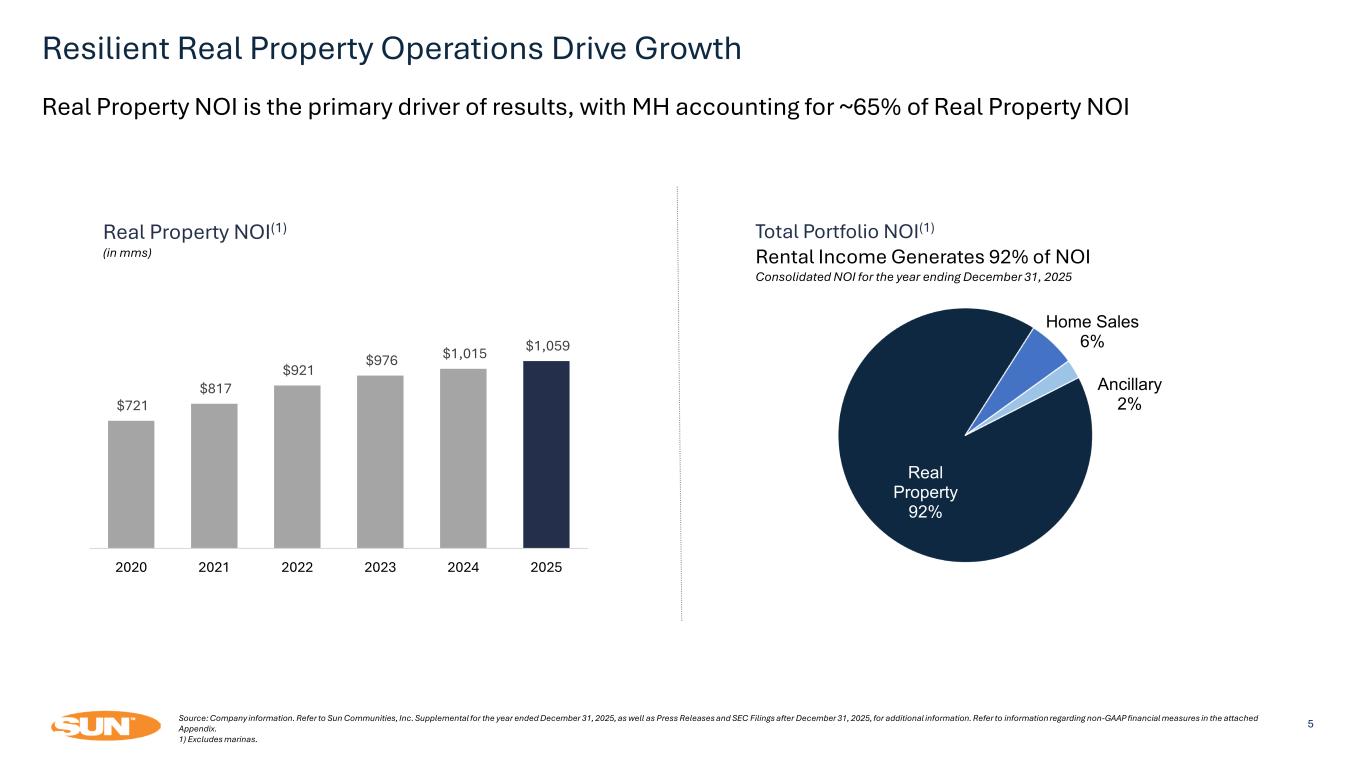4 UK  294 communities  ~100,000 sites  97%+ occupancy  166 communities  ~33,000 annual sites  ~24,000 transient sites(2)  53 parks  ~18,000 annual sites  ~4,000 transient sites RVMH ~179,000 sites across 513 communities(1) SYLVAN CROSSING – CHELSEA, MI STOWFORD FARM MEADOWS – DEVON, UKJELLYSTONE PARKTM QUARRYVILLE – QUARRYVILLE, PA Largest Publicly-Traded Owner and Operator of MH and RV Communities Source: Company information. Refer to Sun Communities, Inc. Supplemental for the year ended December 31, 2025, as well as Press Releases and SEC Filings after December 31, 2025, for additional information. Refer to information regarding non-GAAP financial measures in the attached Appendix. 1) As of December 31, 2025. 2) ~50% of transient sites are candidates for conversion to annual sites.