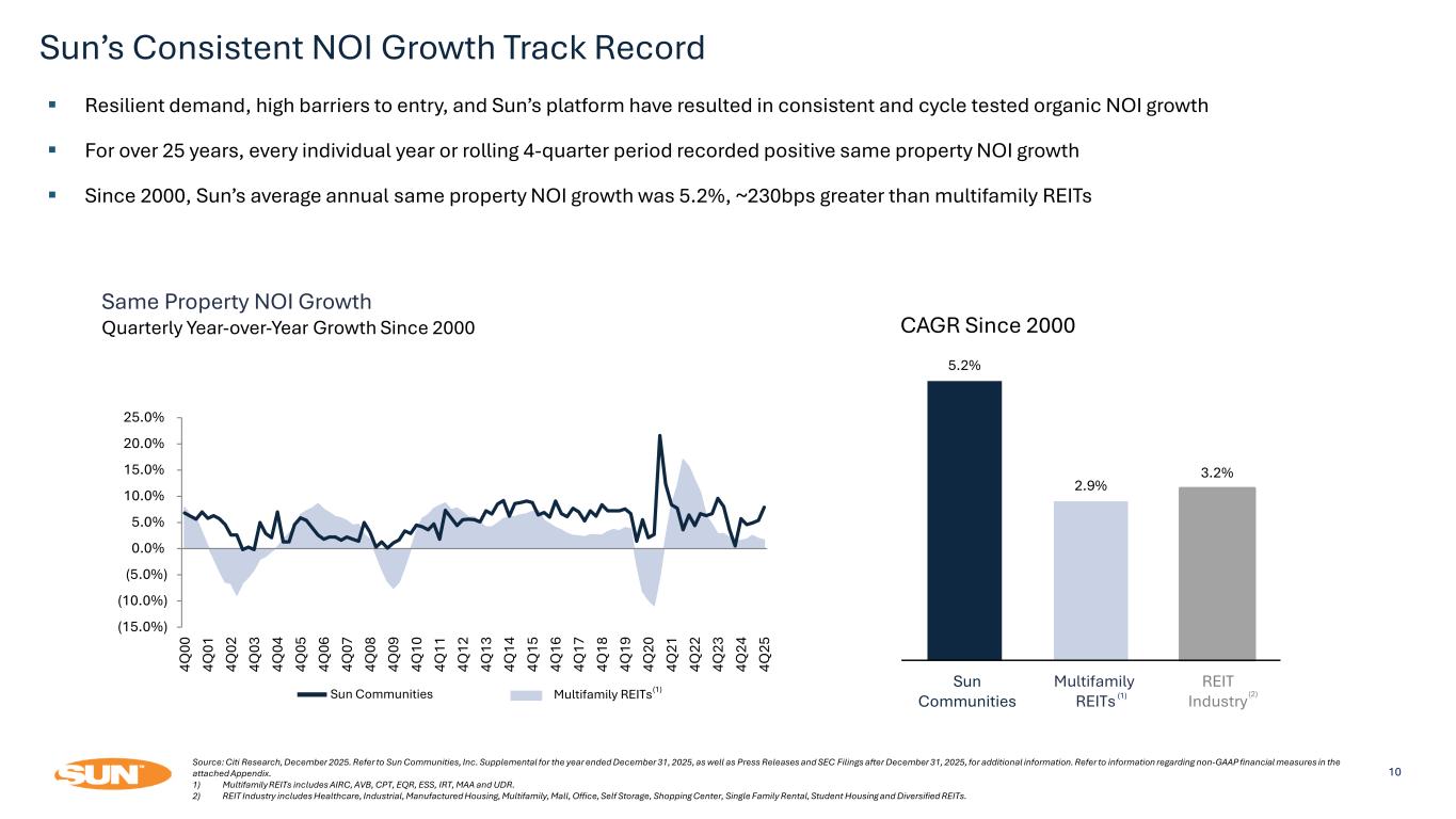 9 9 Strategic Investment Investing in people, communities, infrastructure and a unified digital backbone Continued Operating Platform Optimization Driving greater consistency, accountability, and efficiency across the organization Thoughtful Capital Allocation Maintaining a strong and flexible balance sheet while delivering growth Leveraging Core Strengths, Improving Earnings Consistency, and Converting Scale into Data-Enabled Operational & Financial Advantage Core Pillars Supporting Sun’s Long-Term Strategy Source: Company information. Refer to Sun Communities, Inc. Supplemental for the year ended December 31, 2025, as well as Press Releases and SEC Filings after December 31, 2025, for additional information. Refer to information regarding non-GAAP financial measures in the attached Appendix.