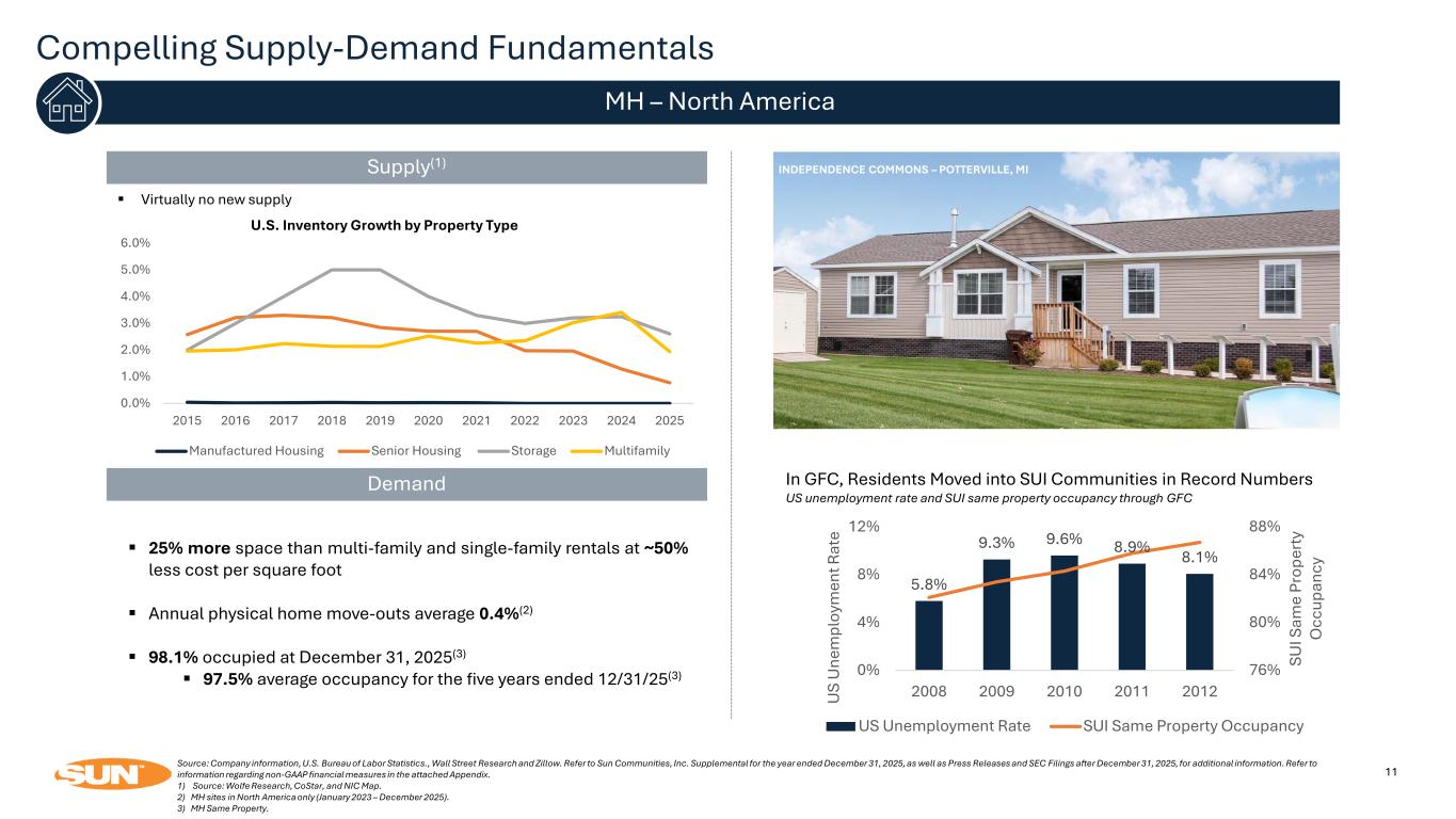 Sun’s Consistent NOI Growth Track Record 10 Multifamily REITsSun Communities  Resilient demand, high barriers to entry, and Sun’s platform have resulted in consistent and cycle tested organic NOI growth  For over 25 years, every individual year or rolling 4-quarter period recorded positive same property NOI growth  Since 2000, Sun’s average annual same property NOI growth was 5.2%, ~230bps greater than multifamily REITs Same Property NOI Growth Quarterly Year-over-Year Growth Since 2000 Source: Citi Research, December 2025. Refer to Sun Communities, Inc. Supplemental for the year ended December 31, 2025, as well as Press Releases and SEC Filings after December 31, 2025, for additional information. Refer to information regarding non-GAAP financial measures in the attached Appendix. 1) Multifamily REITs includes AIRC, AVB, CPT, EQR, ESS, IRT, MAA and UDR. 2) REIT Industry includes Healthcare, Industrial, Manufactured Housing, Multifamily, Mall, Office, Self Storage, Shopping Center, Single Family Rental, Student Housing and Diversified REITs. (1) CAGR Since 2000 Sun Communities Multifamily REITs REIT Industry(1) (2) 5.2% 2.9% 3.2% (15.0%) (10.0%) (5.0%) 0.0% 5.0% 10.0% 15.0% 20.0% 25.0% 4Q 00 4Q 01 4Q 02 4Q 03 4Q 04 4Q 05 4Q 06 4Q 07 4Q 08 4Q 09 4Q 10 4Q 11 4Q 12 4Q 13 4Q 14 4Q 15 4Q 16 4Q 17 4Q 18 4Q 19 4Q 20 4Q 21 4Q 22 4Q 23 4Q 24 4Q 25