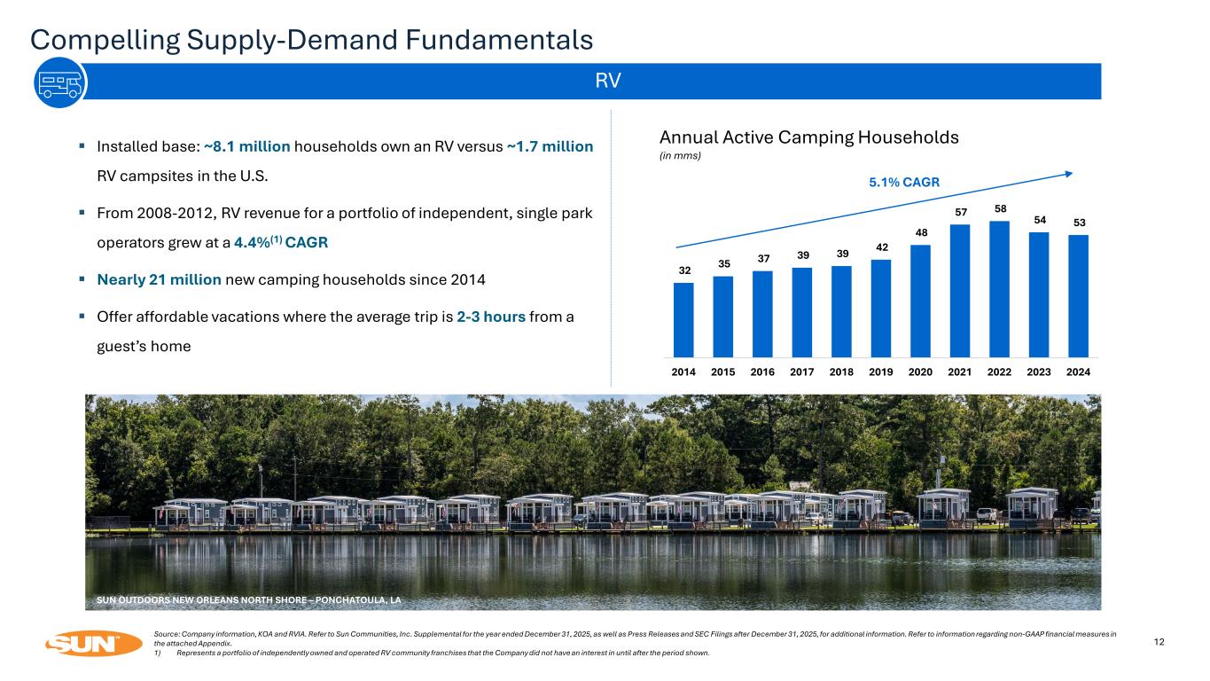 Compelling Supply-Demand Fundamentals 11 MH – North America Source: Company information, U.S. Bureau of Labor Statistics., Wall Street Research and Zillow. Refer to Sun Communities, Inc. Supplemental for the year ended December 31, 2025, as well as Press Releases and SEC Filings after December 31, 2025, for additional information. Refer to information regarding non-GAAP financial measures in the attached Appendix. 1) Source: Wolfe Research, CoStar, and NIC Map. 2) MH sites in North America only (January 2023 – December 2025). 3) MH Same Property.  Virtually no new supply  25% more space than multi-family and single-family rentals at ~50% less cost per square foot  Annual physical home move-outs average 0.4%(2)  98.1% occupied at December 31, 2025(3)  97.5% average occupancy for the five years ended 12/31/25(3) Demand Supply(1) In GFC, Residents Moved into SUI Communities in Record Numbers US unemployment rate and SUI same property occupancy through GFC INDEPENDENCE COMMONS – POTTERVILLE, MI 5.8% 9.3% 9.6% 8.9% 8.1% 76% 80% 84% 88% 0% 4% 8% 12% 2008 2009 2010 2011 2012 SU I S am e Pr op er ty O cc up an cy U S U ne m pl oy m en t R at e US Unemployment Rate SUI Same Property Occupancy 0.0% 1.0% 2.0% 3.0% 4.0% 5.0% 6.0% 2015 2016 2017 2018 2019 2020 2021 2022 2023 2024 2025 Manufactured Housing Senior Housing Storage Multifamily U.S. Inventory Growth by Property Type