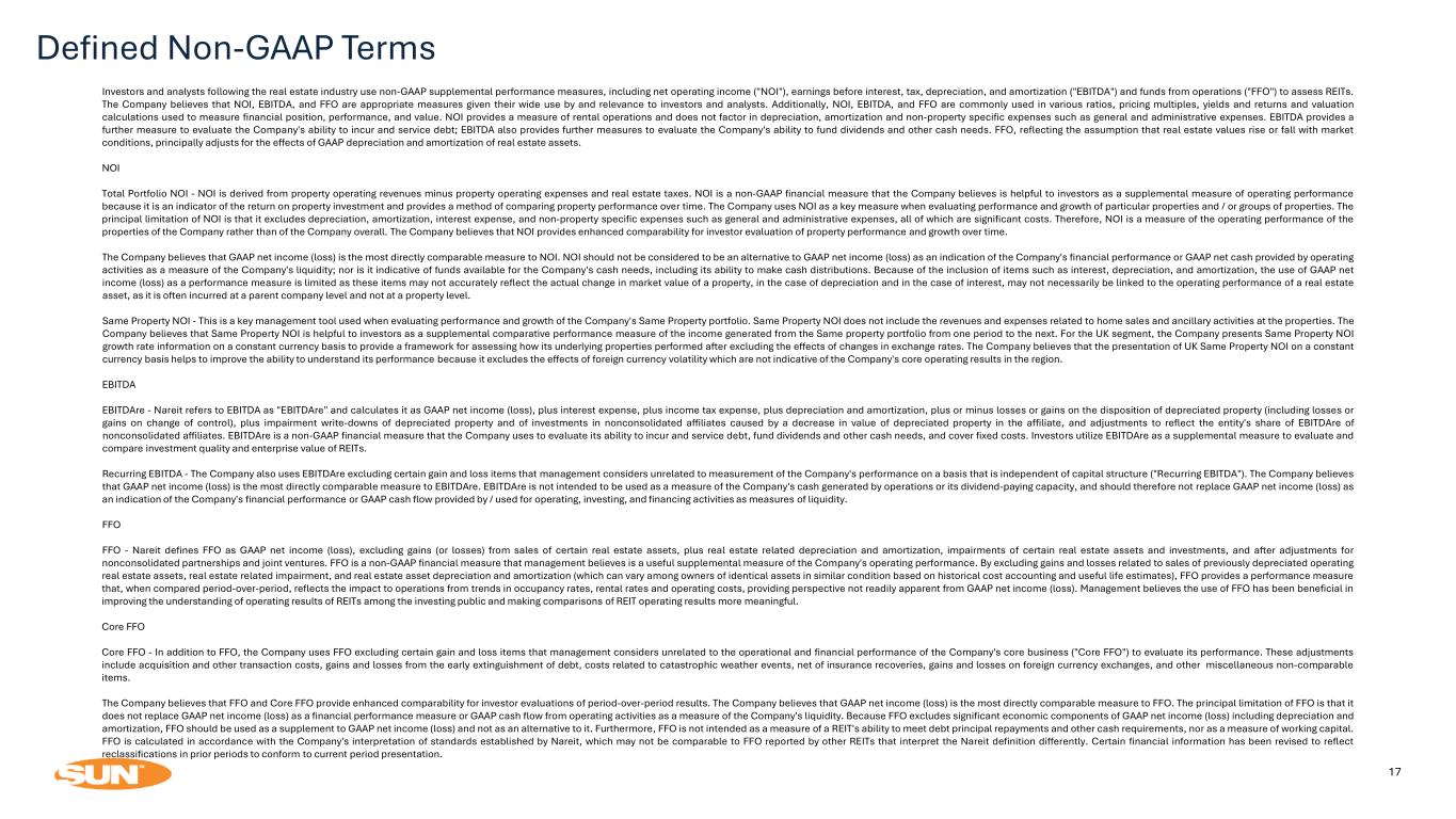 Defined Non-GAAP Terms 17 Investors and analysts following the real estate industry use non-GAAP supplemental performance measures, including net operating income ("NOI"), earnings before interest, tax, depreciation, and amortization ("EBITDA") and funds from operations ("FFO") to assess REITs. The Company believes that NOI, EBITDA, and FFO are appropriate measures given their wide use by and relevance to investors and analysts. Additionally, NOI, EBITDA, and FFO are commonly used in various ratios, pricing multiples, yields and returns and valuation calculations used to measure financial position, performance, and value. NOI provides a measure of rental operations and does not factor in depreciation, amortization and non-property specific expenses such as general and administrative expenses. EBITDA provides a further measure to evaluate the Company's ability to incur and service debt; EBITDA also provides further measures to evaluate the Company's ability to fund dividends and other cash needs. FFO, reflecting the assumption that real estate values rise or fall with market conditions, principally adjusts for the effects of GAAP depreciation and amortization of real estate assets. NOI Total Portfolio NOI - NOI is derived from property operating revenues minus property operating expenses and real estate taxes. NOI is a non-GAAP financial measure that the Company believes is helpful to investors as a supplemental measure of operating performance because it is an indicator of the return on property investment and provides a method of comparing property performance over time. The Company uses NOI as a key measure when evaluating performance and growth of particular properties and / or groups of properties. The principal limitation of NOI is that it excludes depreciation, amortization, interest expense, and non-property specific expenses such as general and administrative expenses, all of which are significant costs. Therefore, NOI is a measure of the operating performance of the properties of the Company rather than of the Company overall. The Company believes that NOI provides enhanced comparability for investor evaluation of property performance and growth over time. The Company believes that GAAP net income (loss) is the most directly comparable measure to NOI. NOI should not be considered to be an alternative to GAAP net income (loss) as an indication of the Company's financial performance or GAAP net cash provided by operating activities as a measure of the Company's liquidity; nor is it indicative of funds available for the Company's cash needs, including its ability to make cash distributions. Because of the inclusion of items such as interest, depreciation, and amortization, the use of GAAP net income (loss) as a performance measure is limited as these items may not accurately reflect the actual change in market value of a property, in the case of depreciation and in the case of interest, may not necessarily be linked to the operating performance of a real estate asset, as it is often incurred at a parent company level and not at a property level. Same Property NOI - This is a key management tool used when evaluating performance and growth of the Company's Same Property portfolio. Same Property NOI does not include the revenues and expenses related to home sales and ancillary activities at the properties. The Company believes that Same Property NOI is helpful to investors as a supplemental comparative performance measure of the income generated from the Same property portfolio from one period to the next. For the UK segment, the Company presents Same Property NOI growth rate information on a constant currency basis to provide a framework for assessing how its underlying properties performed after excluding the effects of changes in exchange rates. The Company believes that the presentation of UK Same Property NOI on a constant currency basis helps to improve the ability to understand its performance because it excludes the effects of foreign currency volatility which are not indicative of the Company's core operating results in the region. EBITDA EBITDAre - Nareit refers to EBITDA as "EBITDAre" and calculates it as GAAP net income (loss), plus interest expense, plus income tax expense, plus depreciation and amortization, plus or minus losses or gains on the disposition of depreciated property (including losses or gains on change of control), plus impairment write-downs of depreciated property and of investments in nonconsolidated affiliates caused by a decrease in value of depreciated property in the affiliate, and adjustments to reflect the entity's share of EBITDAre of nonconsolidated affiliates. EBITDAre is a non-GAAP financial measure that the Company uses to evaluate its ability to incur and service debt, fund dividends and other cash needs, and cover fixed costs. Investors utilize EBITDAre as a supplemental measure to evaluate and compare investment quality and enterprise value of REITs. Recurring EBITDA - The Company also uses EBITDAre excluding certain gain and loss items that management considers unrelated to measurement of the Company's performance on a basis that is independent of capital structure ("Recurring EBITDA"). The Company believes that GAAP net income (loss) is the most directly comparable measure to EBITDAre. EBITDAre is not intended to be used as a measure of the Company's cash generated by operations or its dividend-paying capacity, and should therefore not replace GAAP net income (loss) as an indication of the Company's financial performance or GAAP cash flow provided by / used for operating, investing, and financing activities as measures of liquidity. FFO FFO - Nareit defines FFO as GAAP net income (loss), excluding gains (or losses) from sales of certain real estate assets, plus real estate related depreciation and amortization, impairments of certain real estate assets and investments, and after adjustments for nonconsolidated partnerships and joint ventu